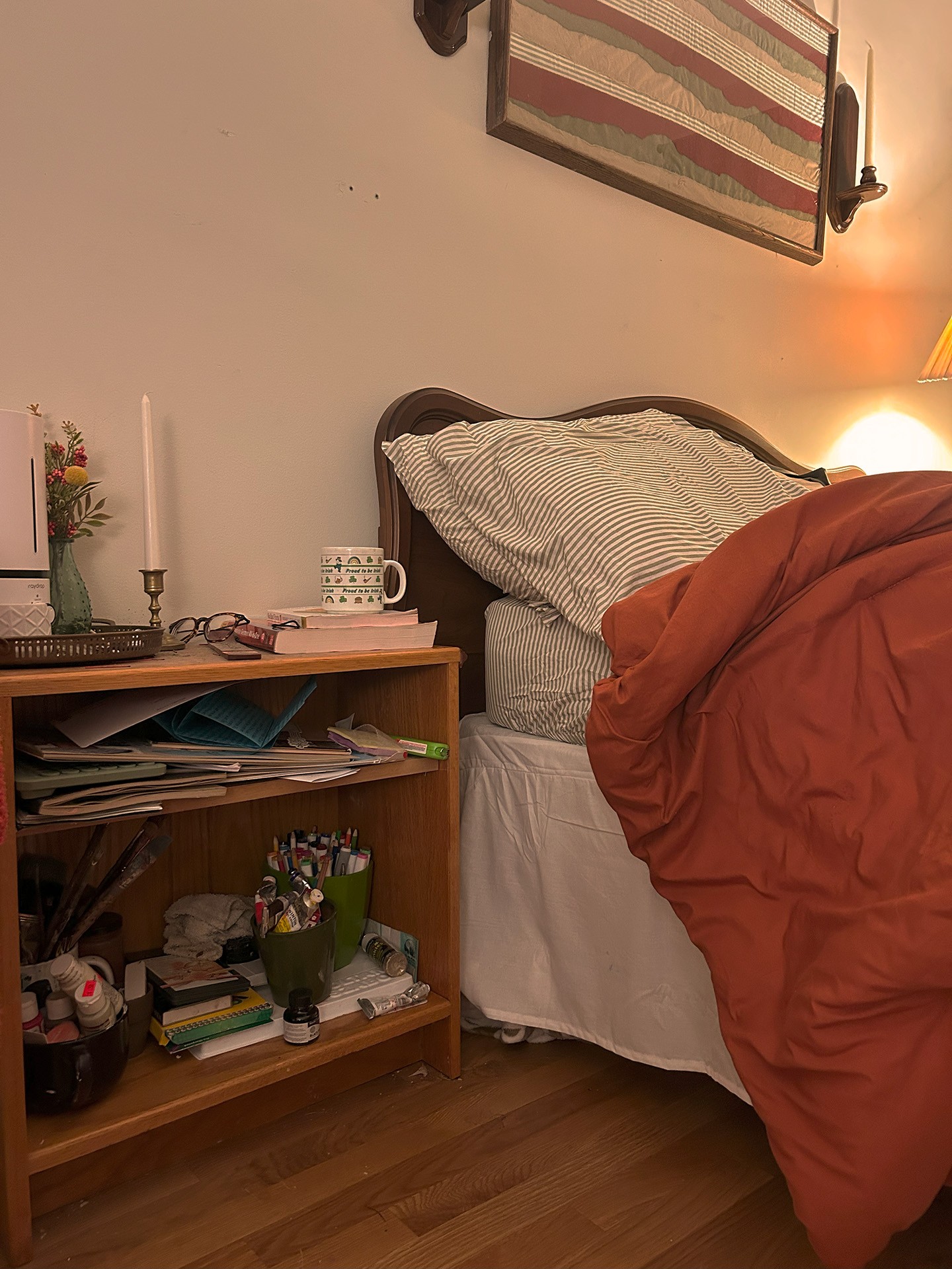 I made a ton of fun things this month!!! For a long time, I have wondered why I could never bring myself to draw and paint as much as I did when I was teenager. I have tried setting up little studio spaces in my apartment, having materials out instead of tucked away, forcing myself to draw for 5 minutes a day, etc. I have found that the only thing that truly works, is keeping my materials close to where I choose to be lazy (or rest depending on how you look at it.) My default spot is my bed. I love sitting in my bed to read, and sorry, I even love to eat in my bed. I love to be cozy in bed. So just like when I was teen, I set my bedside table up to hold all my art supplies. It’s nice and open, so all I have to do is just reach over and grab what I need when inspiration strikes. I even have a little shitty blanket tucked under my bed that I can use a little tarp so I don’t get my bed all gross.
