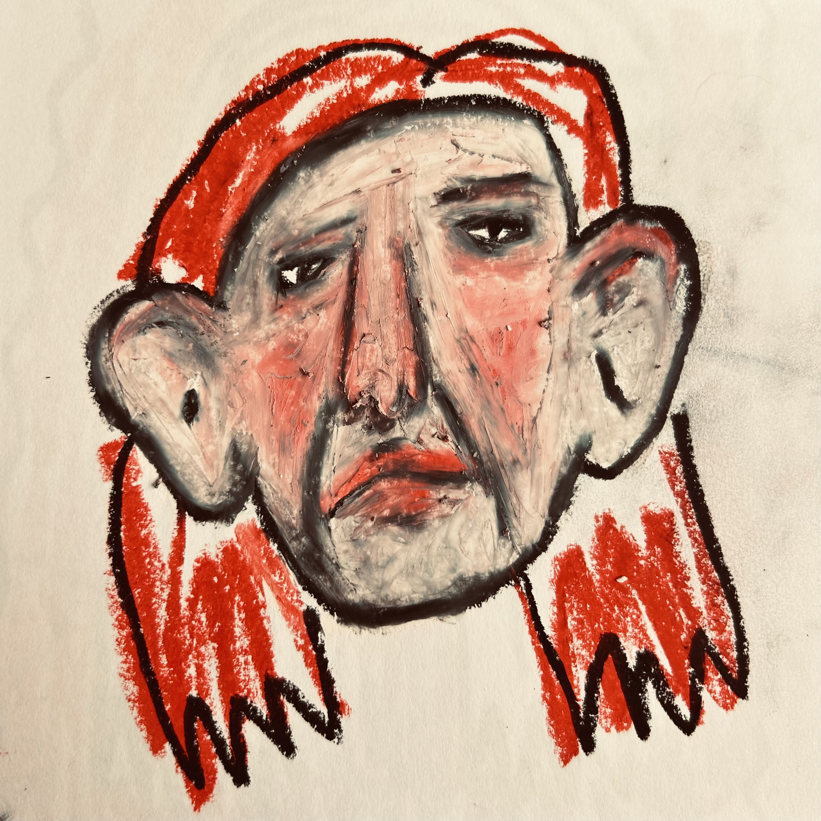 Once upon a time, I walked to the art store and bought some budget oil pastels so I could draw with plenty of rough shitty texture. I thought I was buying a custard color, turns out, it was not! It was a transparent medium, which pretty much lets you blend and gives a cool texture. You can really see I went crazy with it under the right eye ball and ear. Delish!