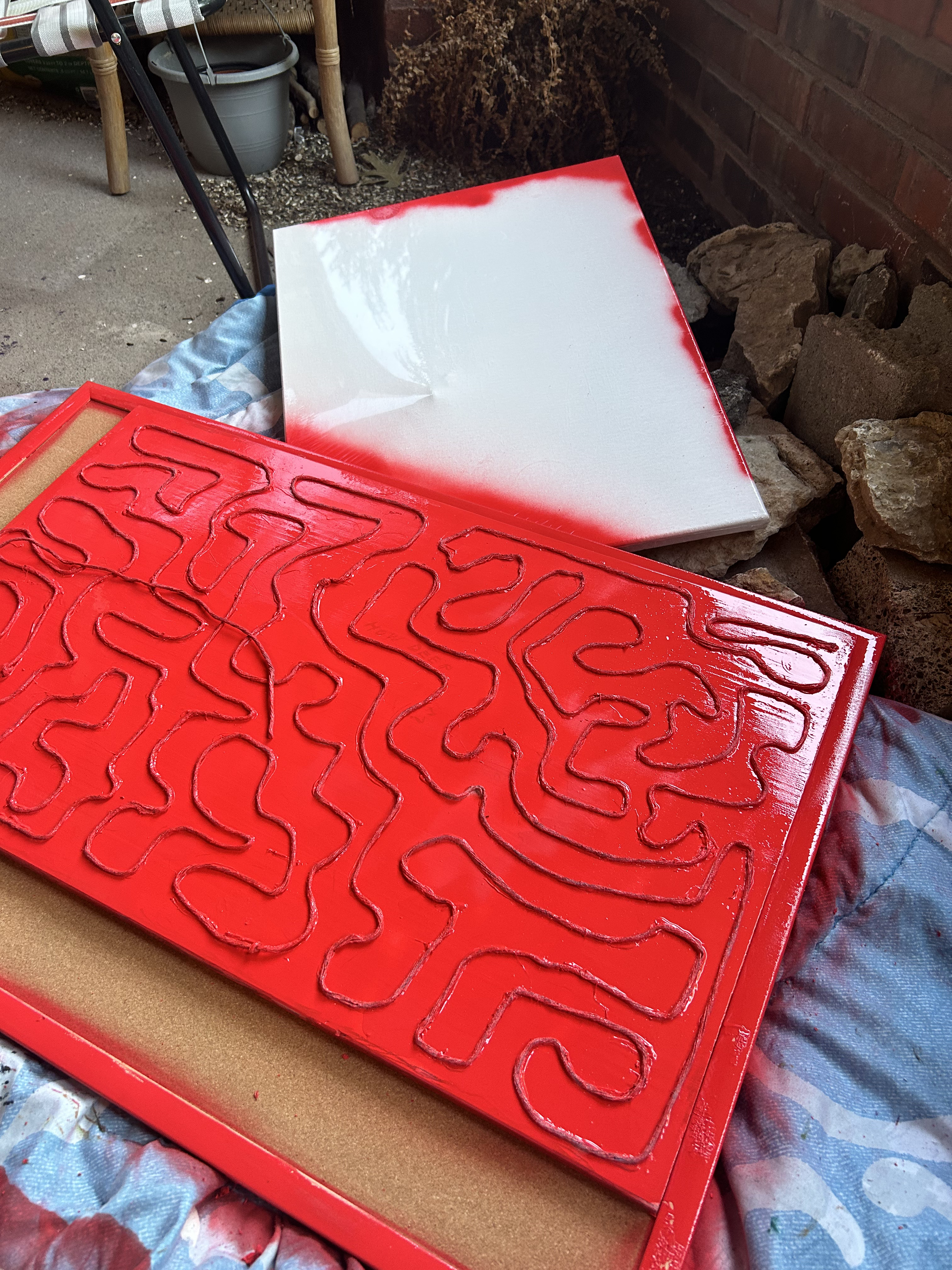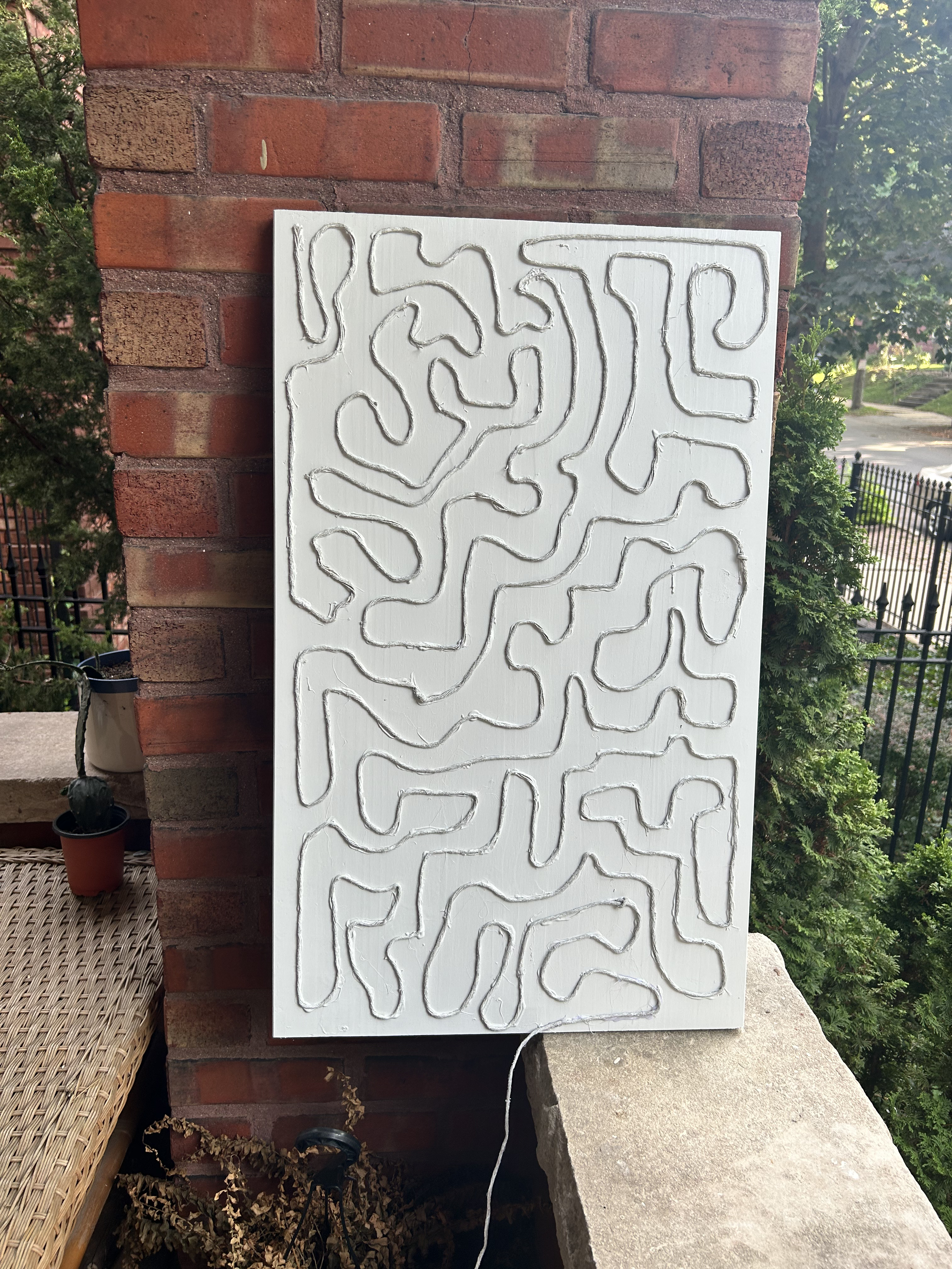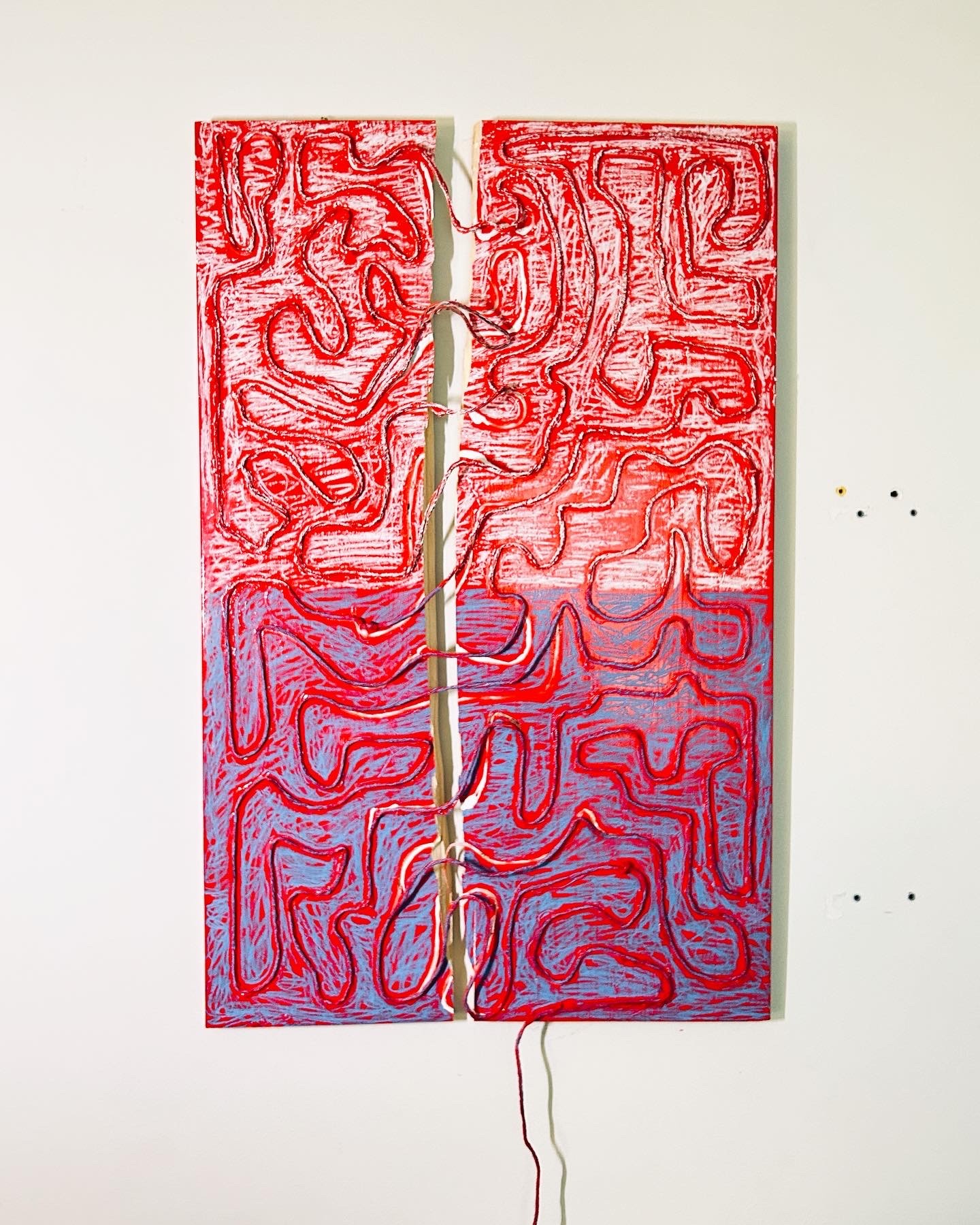 This thing has a very long story. I have posted about this on my instagram before, but it recently took on a new life. We have a huge banner hanging on the parking garage of the library, and we needed to measure it before we can put any designs in action. We don’t have a massive tape measure, so we decided to use some twine. I went to the top of the garage, tied a glue bottle to the end (for weight) and slowly dropped the bottle down to my coworkers. I marked the top of the twine, they marked the bottom, and we brought it back inside to measure. The twine ended up being 40 feet. Wow! Then I took it home, painted some wood white, glued it all over the dang thing, decided to spray paint the whole thing white, decided I didn't like that, decided to spray paint the whole thing red, decided I didn’t like that, decided to scribble on it with some blue and white to make it vibrate visually, liked it, hung it up..... and the end at the time. This took me literal months because I was waiting for it all to speak to me, and I did like it, but I wasn't totally satisfied. It looked cool, but I couldn't quite see myself in it. AND THEN... One morning I woke up to it randomly falling off my wall and it split in half. I was so excited. After all this time trying to make it perfect, all I needed was some imperfection. It suddenly felt like something I had made, and had more of a concept that felt very personal to me.