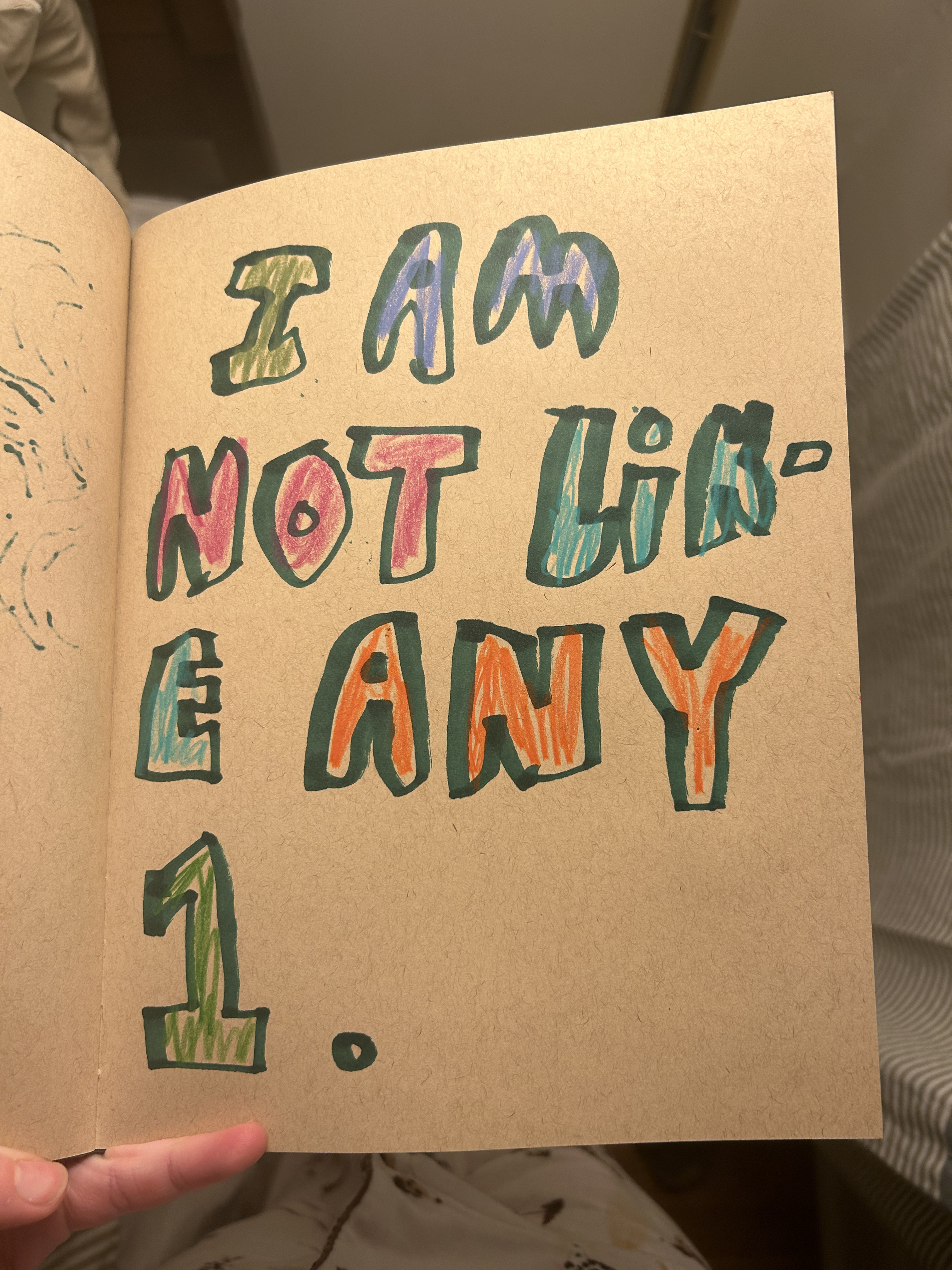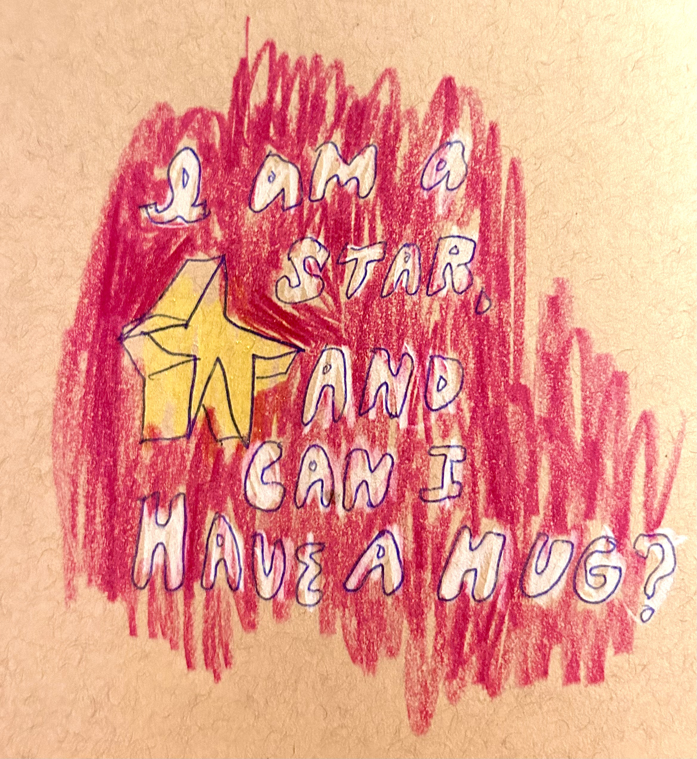 One of my favorite things to do creatively is to write little delicious sentences that feel really good in my brain, like “I am a star and can I have a hug”. Sometimes I draw first and then write, but most of the time I have a phrase that is stuck in my head, and I spit it out and draw to how it feels.