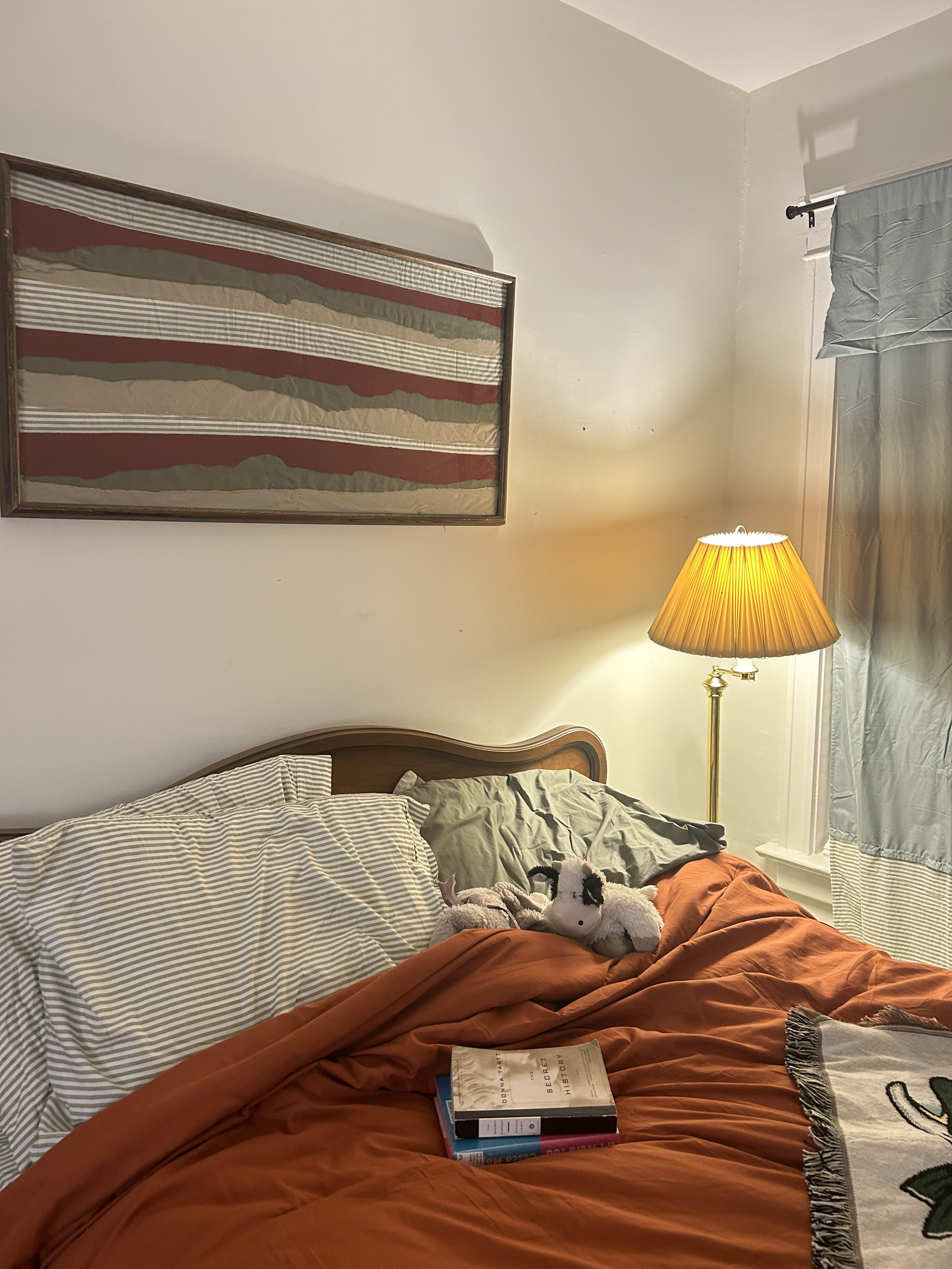 I got the inspiration to work with fabric after seeing an exhibition at the library from The Weavers Guild of Kansas City (shout out to my coworker Craig for putting on all the exhibitions at the library!!) I loved all the different textures and colors and folds and how much comfort they brought to the space. I want my space to have warmth and comfort!! So I went to the thrift store to find some fabrics that spoke to me, in the colors that bring me warmth and comfort. I am obsessed with sagey greens and orangey reds and creams together, probably because of my favorite coffee shop in the world. Broadway cafe in Westport is has lots of reds and oranges and creams and sage colors. I love going there and seeing familiar faces, and when I am there I know I am about to either draw or read my heart out. These colors remind me of my happy place, and bring me warmth and comfort. Once I got my thrifted sheets and table cloths, (and threw in the top sheet that came with the sheets on my bed) I got to ripping. I wanted raw edges and threads, no perfection allowed! I like natural materials in my home because it makes me feel more connected to the world and I want to make imperfect art for my home for the same reason. I put the fabric strips in a frame and I had and then... oops, I broke the glass. A little too imperfect. I taped it up, but I was still nervous about hanging it above my sleeping head. Then, I thrifted a wooden frame I liked better and got the strips super in there in the jankiest way imaginable involving a staple gun and masking tape. Now, it’s hanging above my bed, it shares the same pattern as my sheets and curtains I made, and I love it!