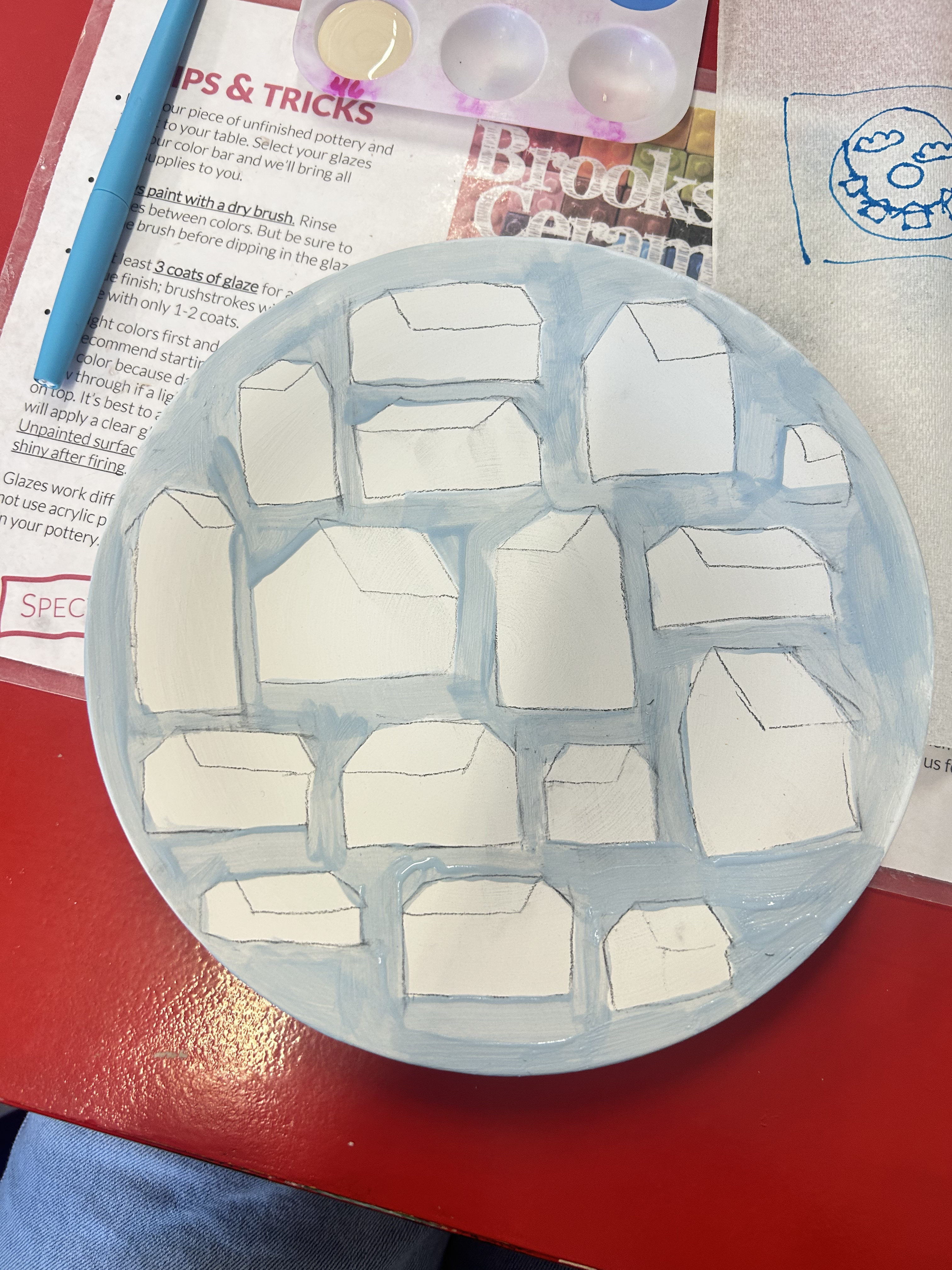 I like to go to a pottery painting place (not a cool pottery studio... it’s one of those pick your pottery, happy 7th birthday type places). I painted little houses and I am excited to see how it turns out once it’s fired!! Stay tuned for next month to see it in its final form.