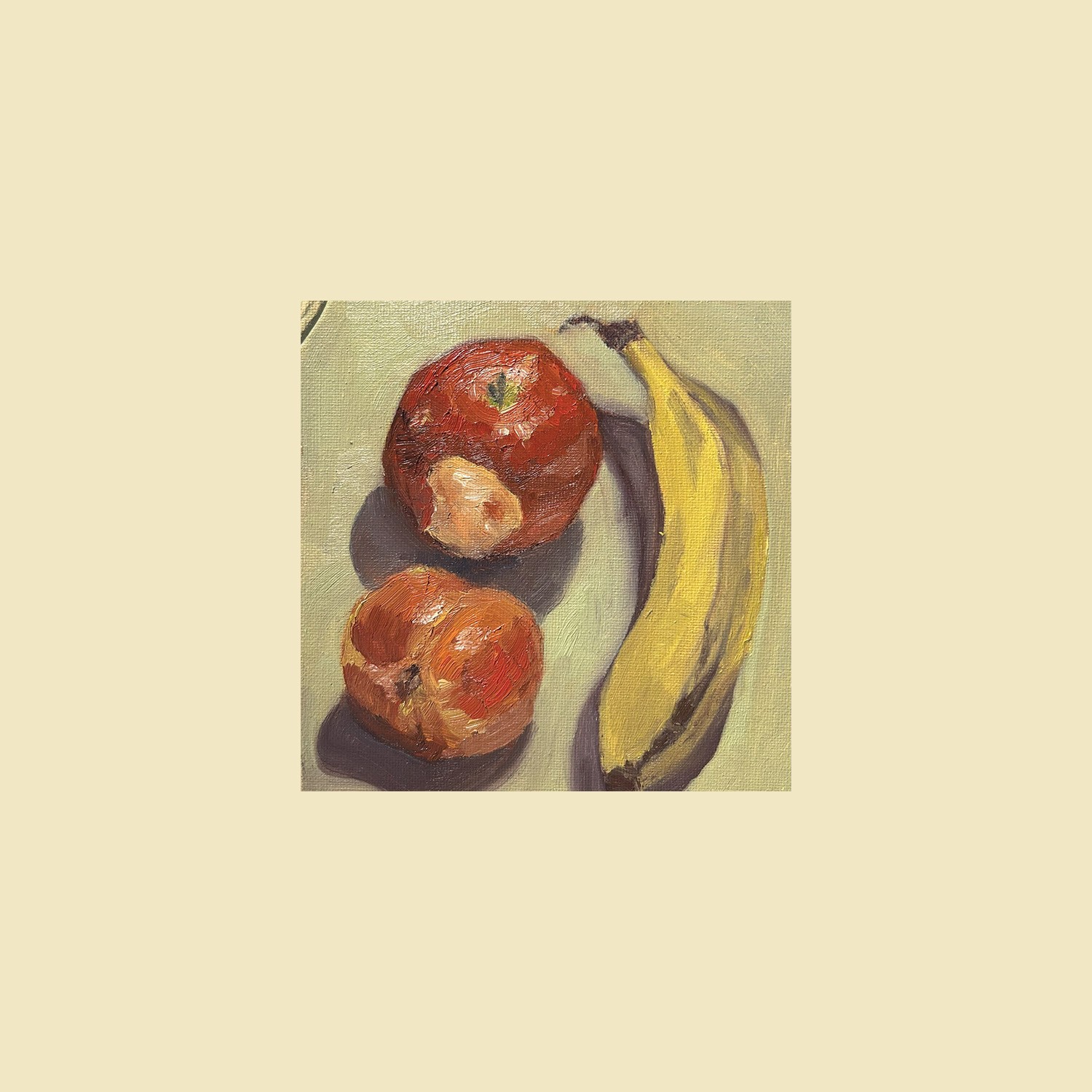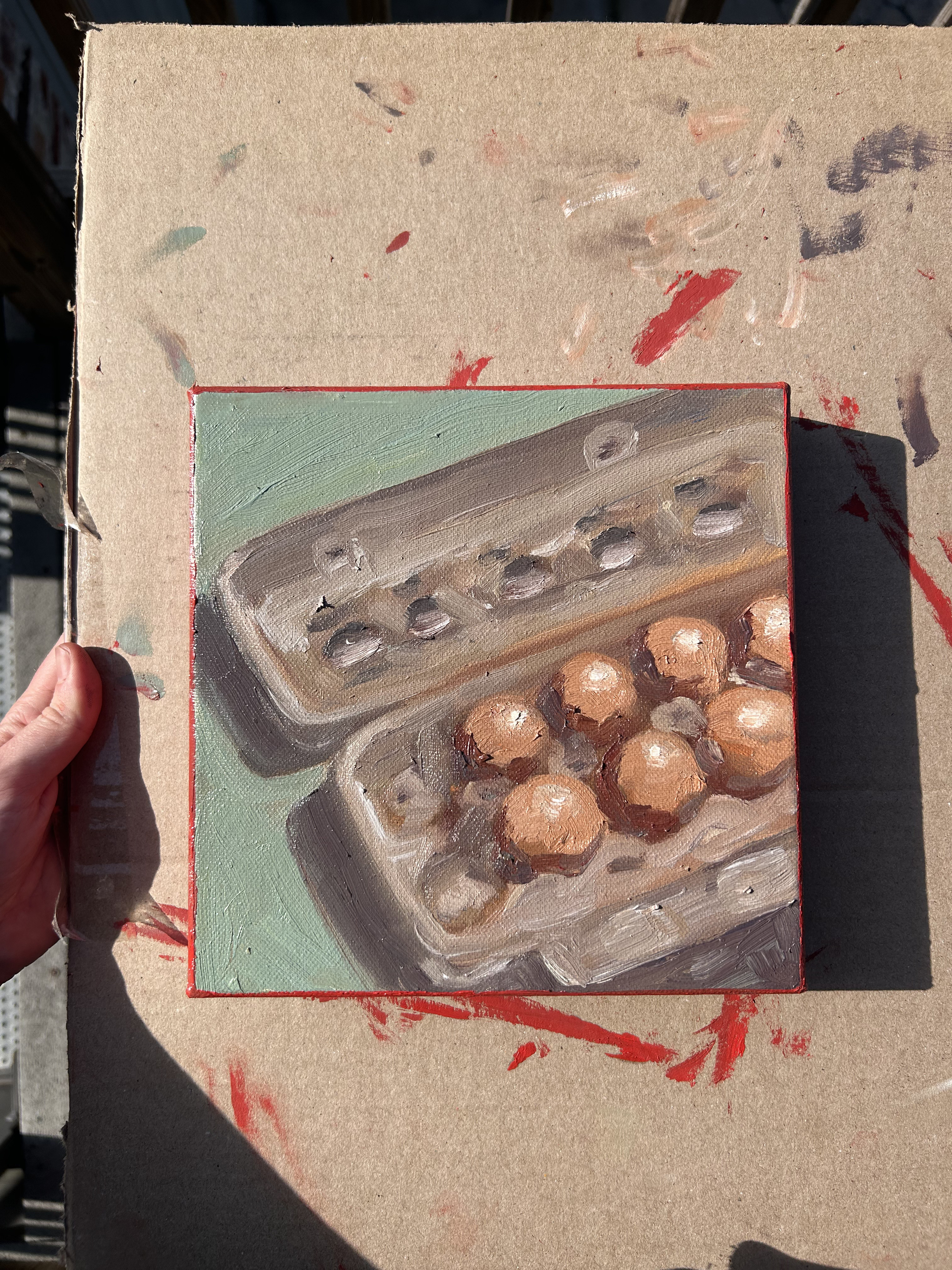 Here is another painting I did a couple days later. I am more proud of the fruit, BUT I am still proud of this because it was a pretty complex subject matter to wrap my head around. An egg carton seems simple until you really look at it. They're pretty weird. This also is not a world changing piece, and is just a still life to get the basics down, but I dipped my toe into the fun pool by painting the sides red and letting a slight “border” poke around. Wow!