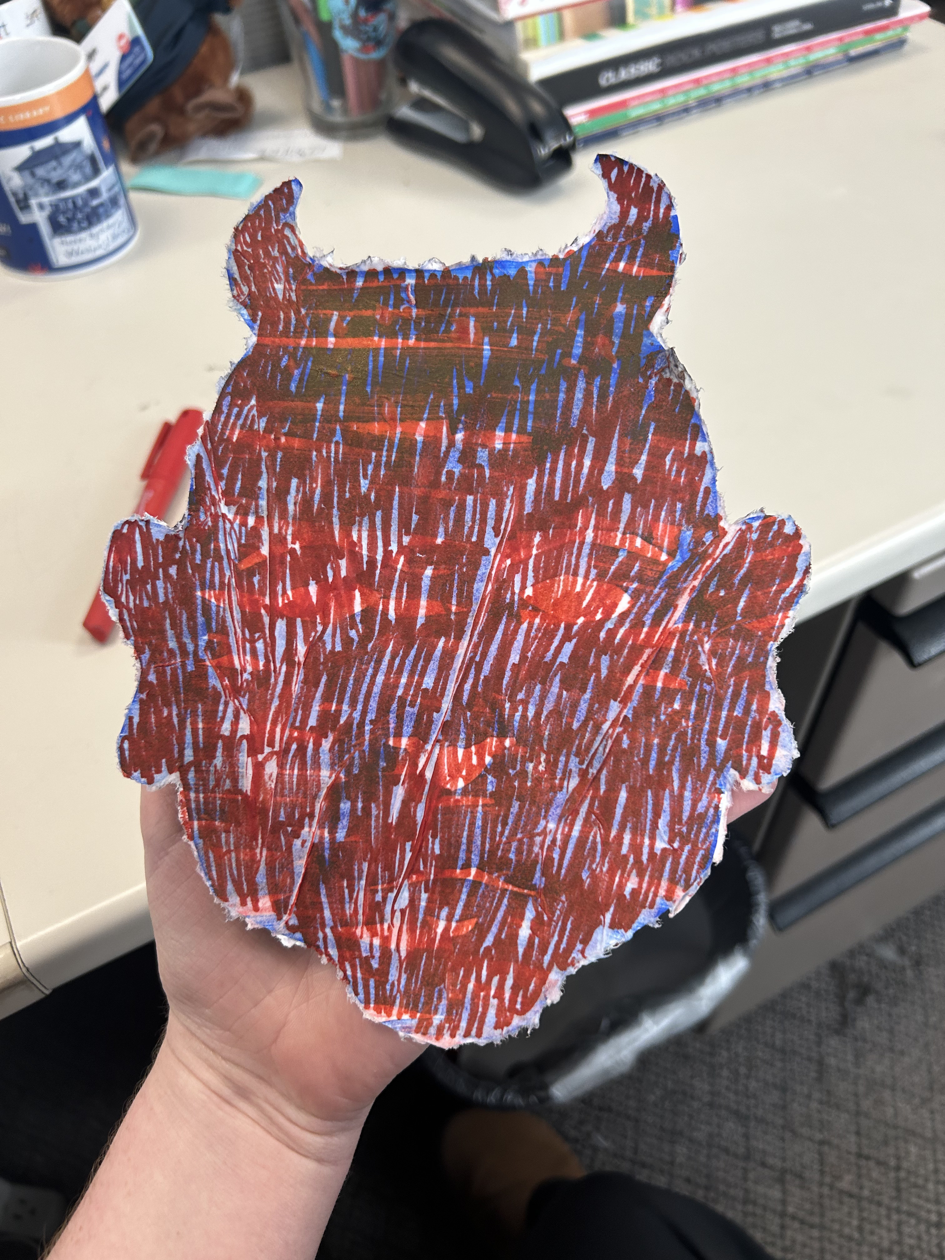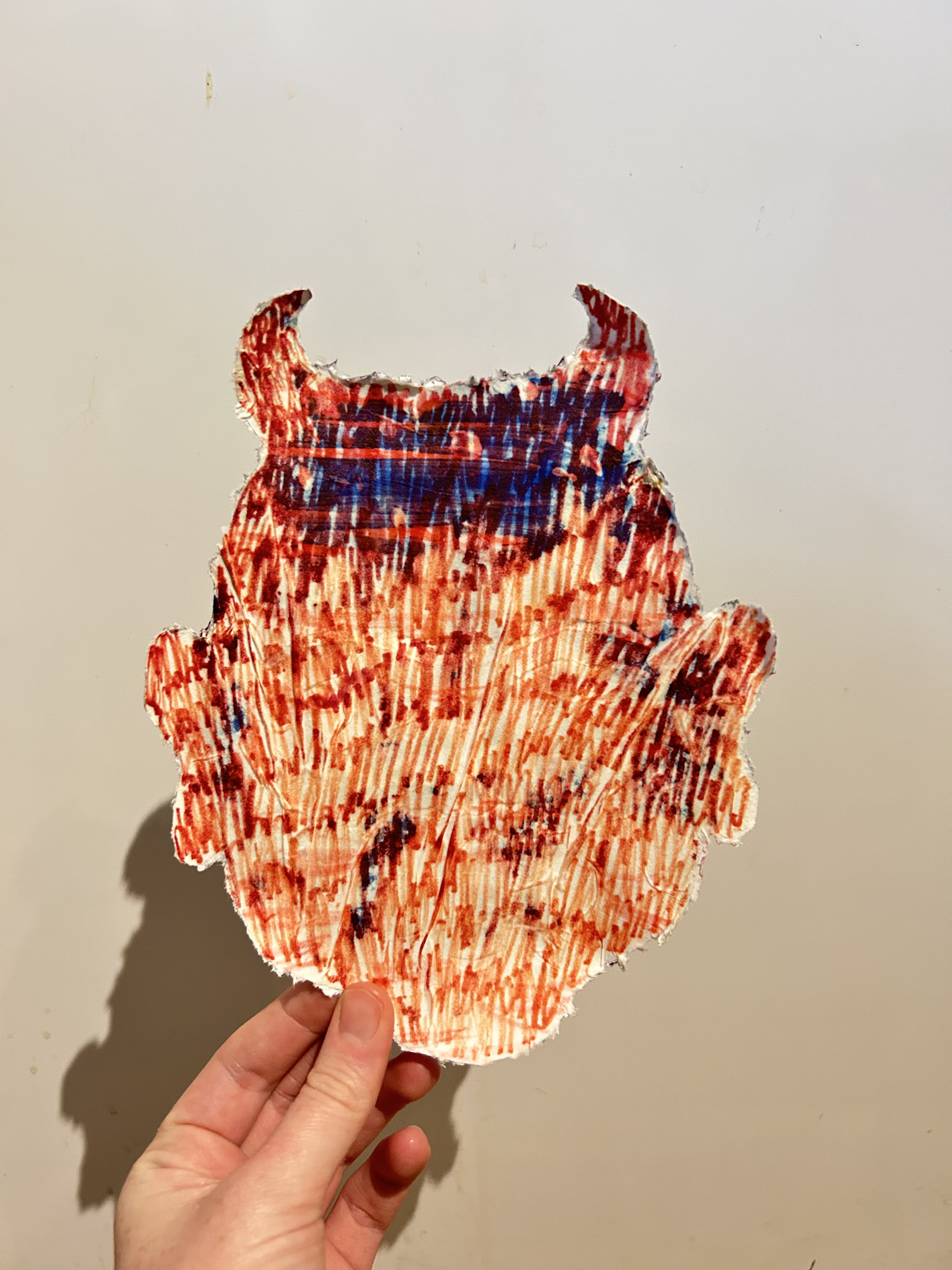 I needed a little break at work and wanted to get creative and messy so here is what I did. I got a scrap piece of paper, and started to cut a face out of it snowflake style (by kind of folding it and cutting it). Then I scribbled on it in blue marker. I was not satisfied, and I felt like it needed paint, but I didn't have any, so I put water in a cup, and soaked some red markers in the water to make “water colors”. Then, I took some tissues and poured the red water on it, and stabbed it with the markers. It looked cool, but kind of had some period vibes going on, so I decided to wait for the tissues to dry a little and cover them in glue (paper mache type direction) and then i peeled them off to give it a fibrous edge, and left some to cover the eye holes up. Then, the next day I scribbled over it in red marker. It still felt kind of lame. (Fun fact- the blue and red markers are Milkwaukee brand as in the tools. I got them from home depot.) I took it home and sprayed some bleach all over it to see what happened. Cool stuff happened- it bleached it. Wow. In the end, I just threw it away because I have way too much art stored in my apartment that I don’t know what to do with (let me know if you ever want to take anything off my hands) and I didn't feel like this was going in any direction other than an exercise, but it was a really fun experiment and I will def take some of these little “techniques” with me into other things. PS. Don’t tell me if the bleach thing isn’t safe. I do not care