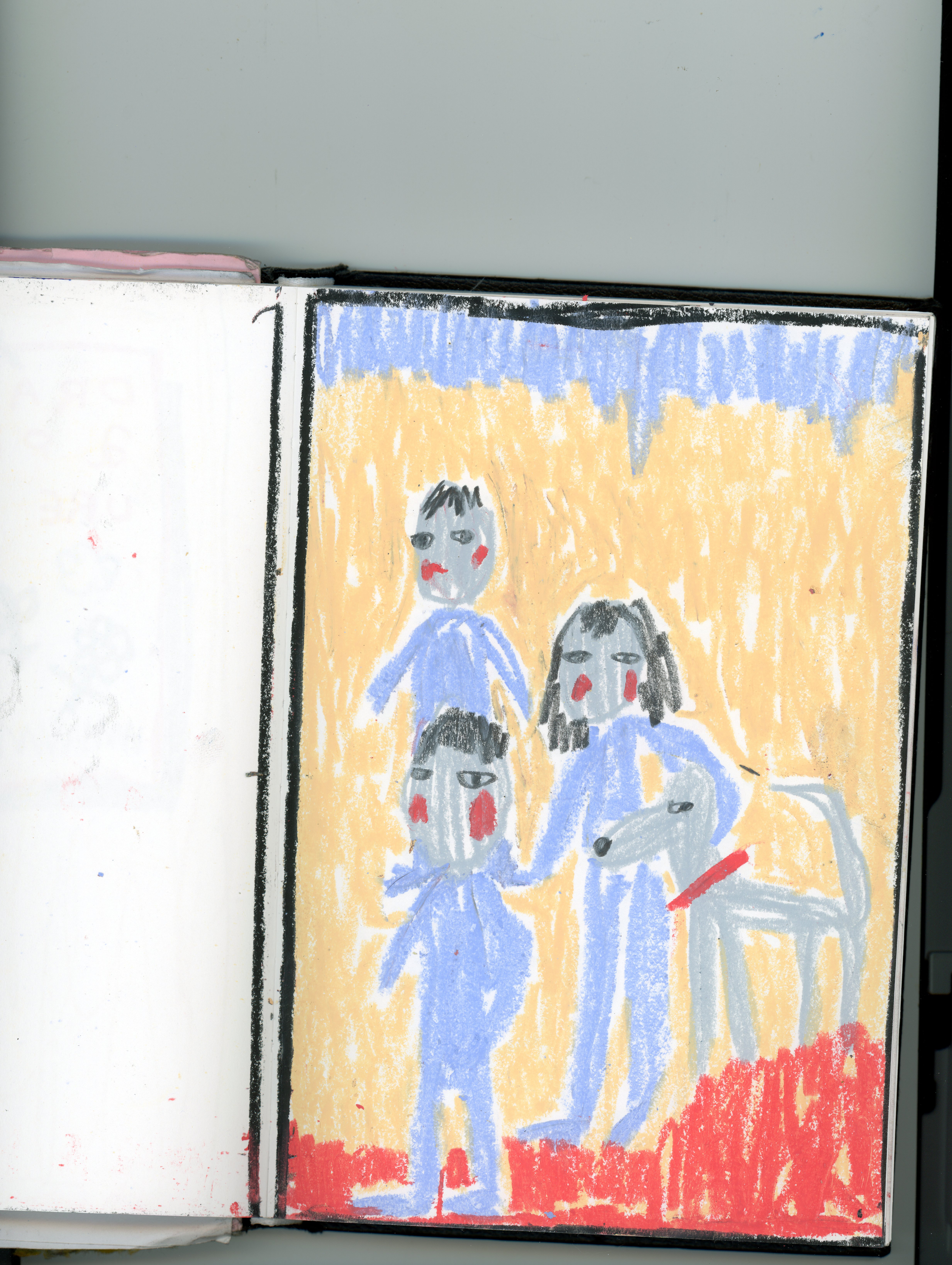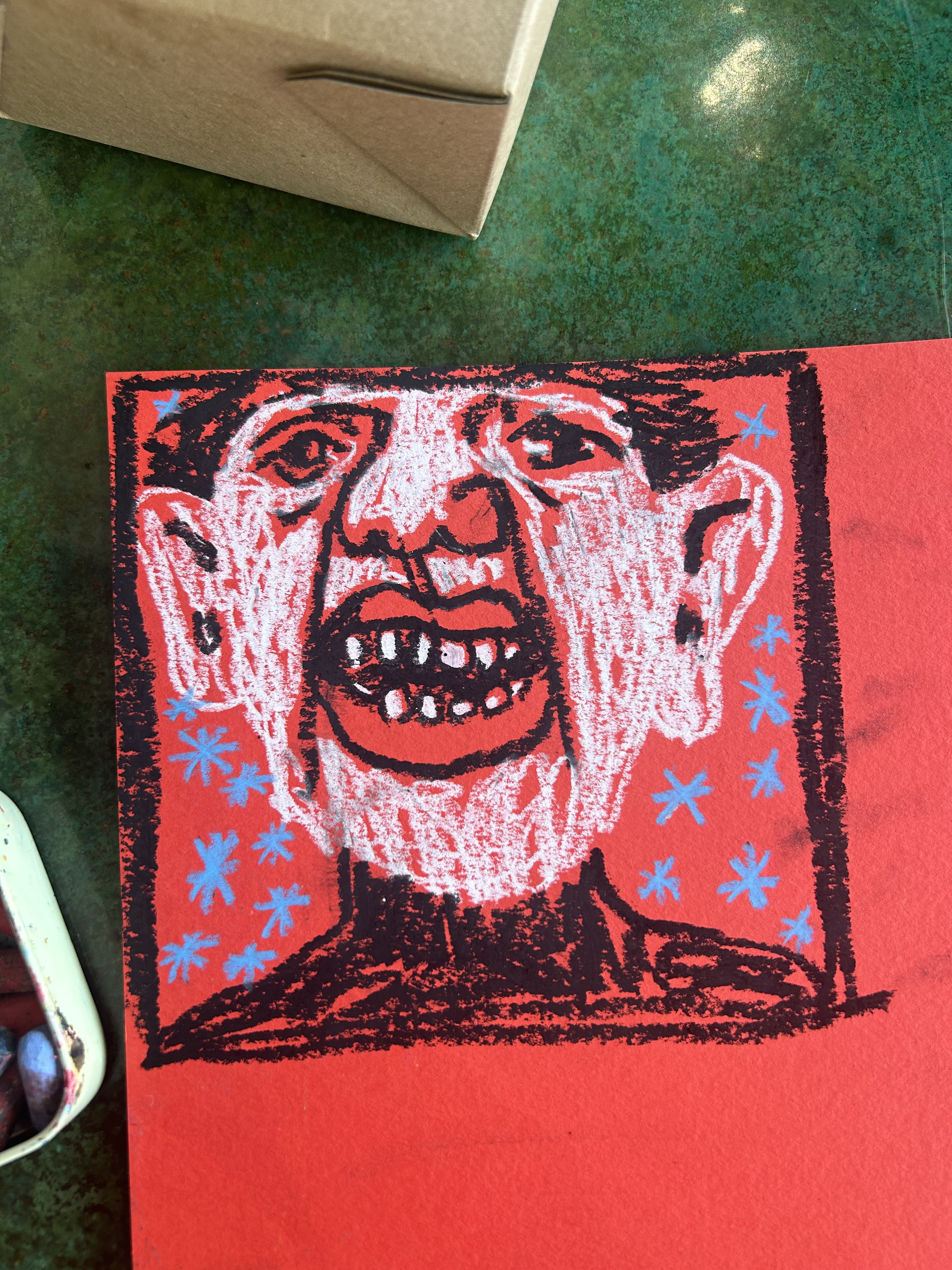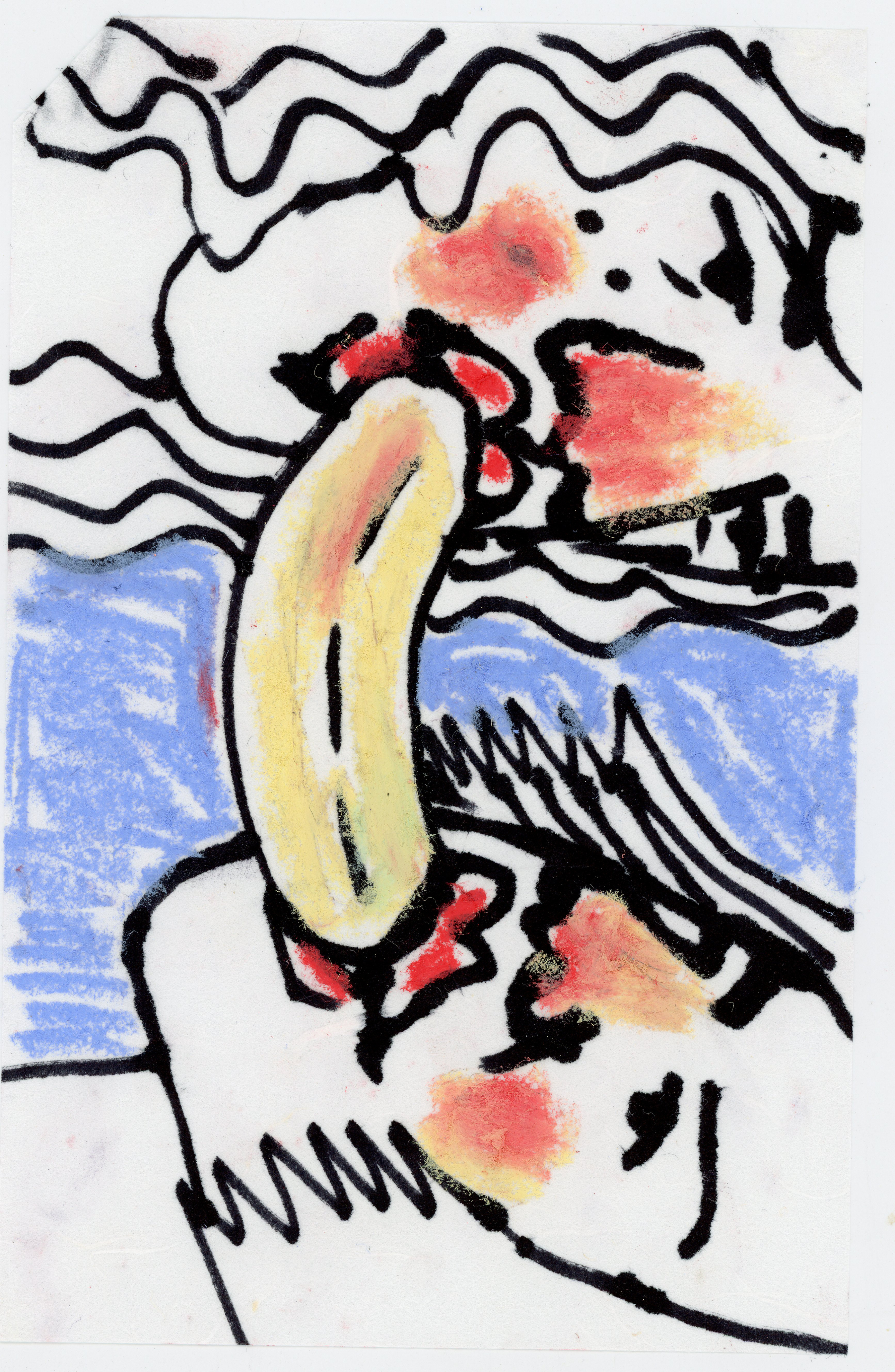 My favorite part of this drawing of two people sharing a banana is the textures. I drew this with oil pastels on a really soft paper with a lot of loose fibers. Go ahead and zoom in there and look and how cool it looks.