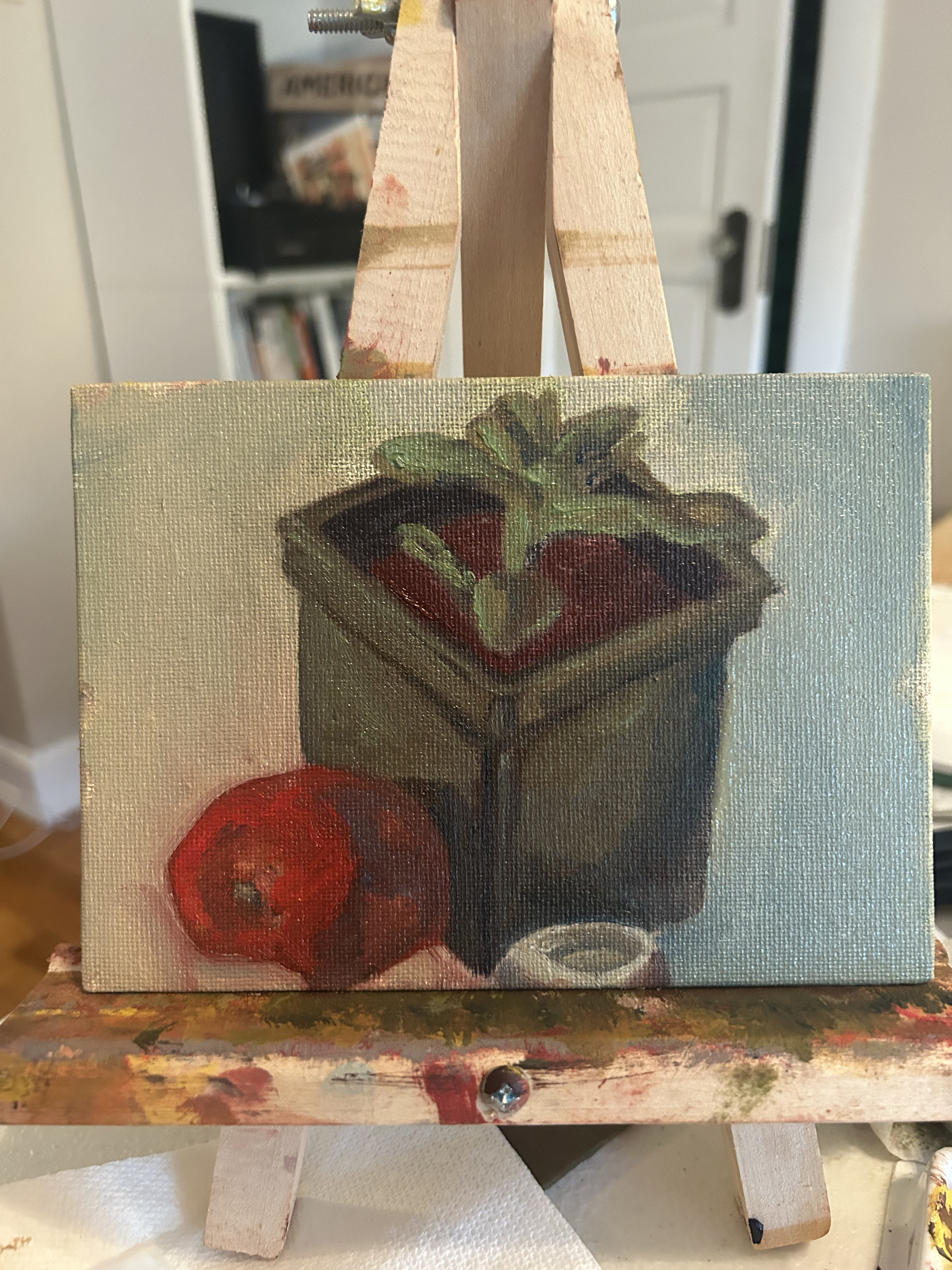 Sometimes I feel so lucky that I have the desire to stare at an apple and to only think about what color it actually is versus what I have learned that it is. I try to shift out of my head and into my eyes to notice how many colors actually make up that red, what shape the apple actually is. I know the apple is red, but is it actually red? It’s like we know a cow says “moo”, but when you really think about how it sounds, it’s more like “ermuughue” I can’t even capture the noise in writing. The attempt at disconnecting myself from what I know about apples, from what I know about circles and the color red, blurring my vision and bringing it back into focus, not knowing how much time has passed... that is an experience I feel so lucky to participate in. I could be doing anything with my time but I choose to stare at apples for hours. I dedicate my time to a form of both meditation and torture. I try to capture what my own brain is processing. Everyone can see the apple, but can they see like I can see it? And then when the painting of the apple looks good, I feel like a god. And when I fail, it of course sucks. And when I fail over and over again, I feel like a fraud. I feel many things that I don’t know how to put into words, because words aren't my thing, pictures are, and if I can’t make a picture, what can I make?