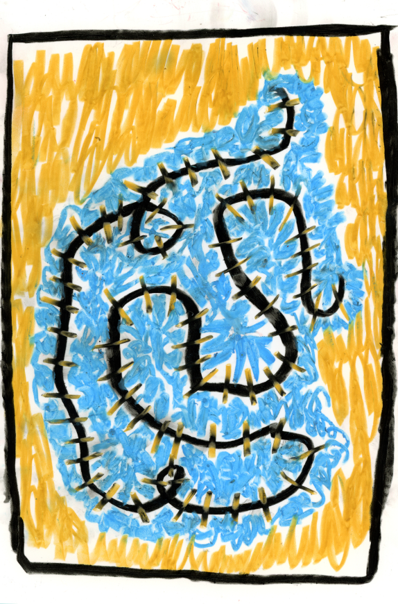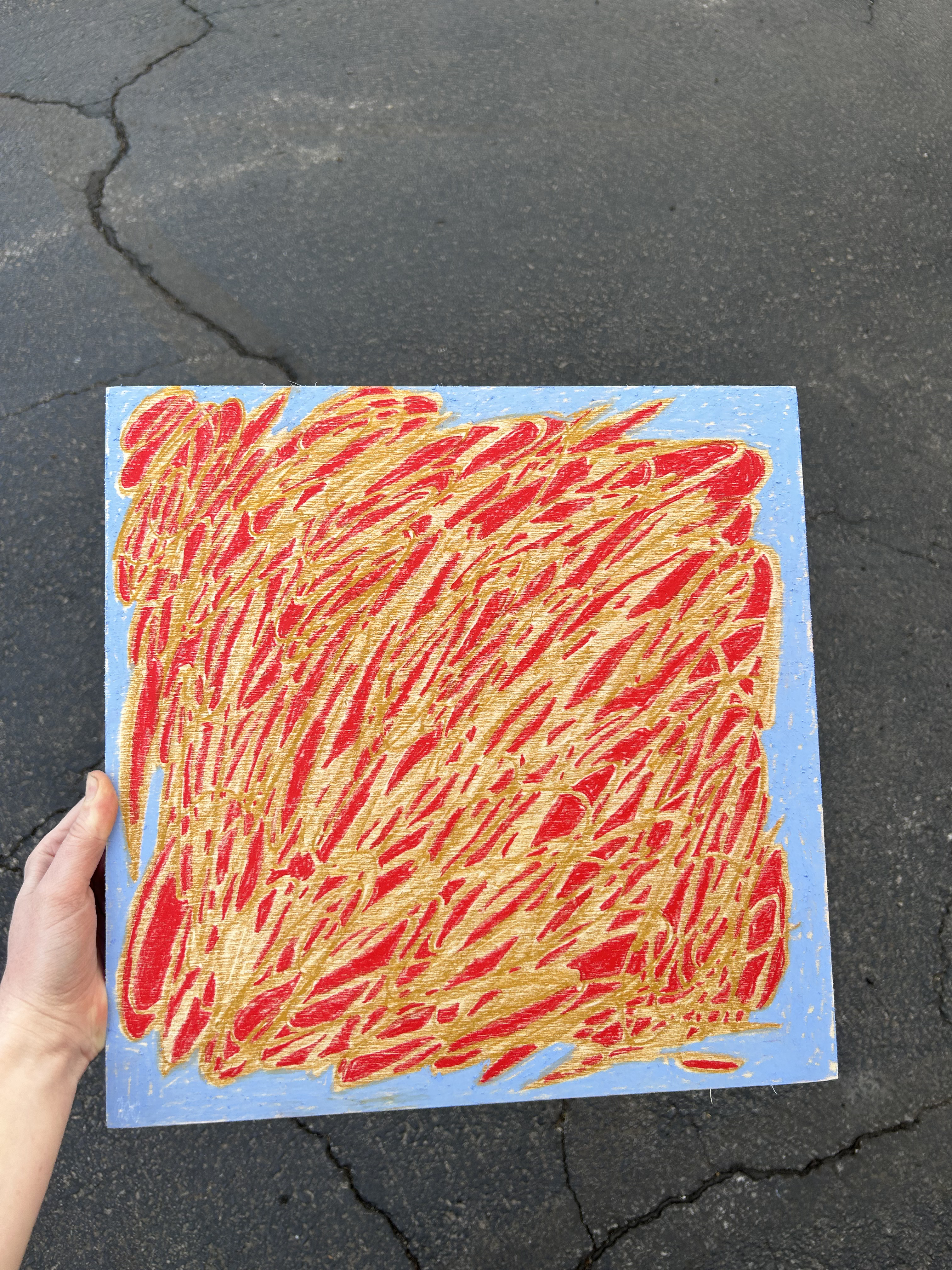 I was scribbling around and decided to color in the holes of my scribbling. I really liked it, so I bought a big wood square and did it again. It was really relaxing, and it looks like spaghetti!