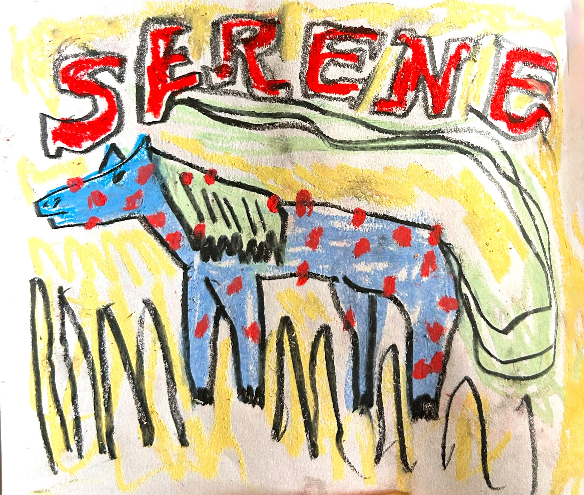 This is a little drawing of a polka dot horse with a long wispy tail. I named her Serene and I really like this drawing. I have been drawing a lot of horses lately, I have never been into horses before so I don’t know what that’s about. Maybe it’s because I like bad drawings and horses can look weird pretty easily.