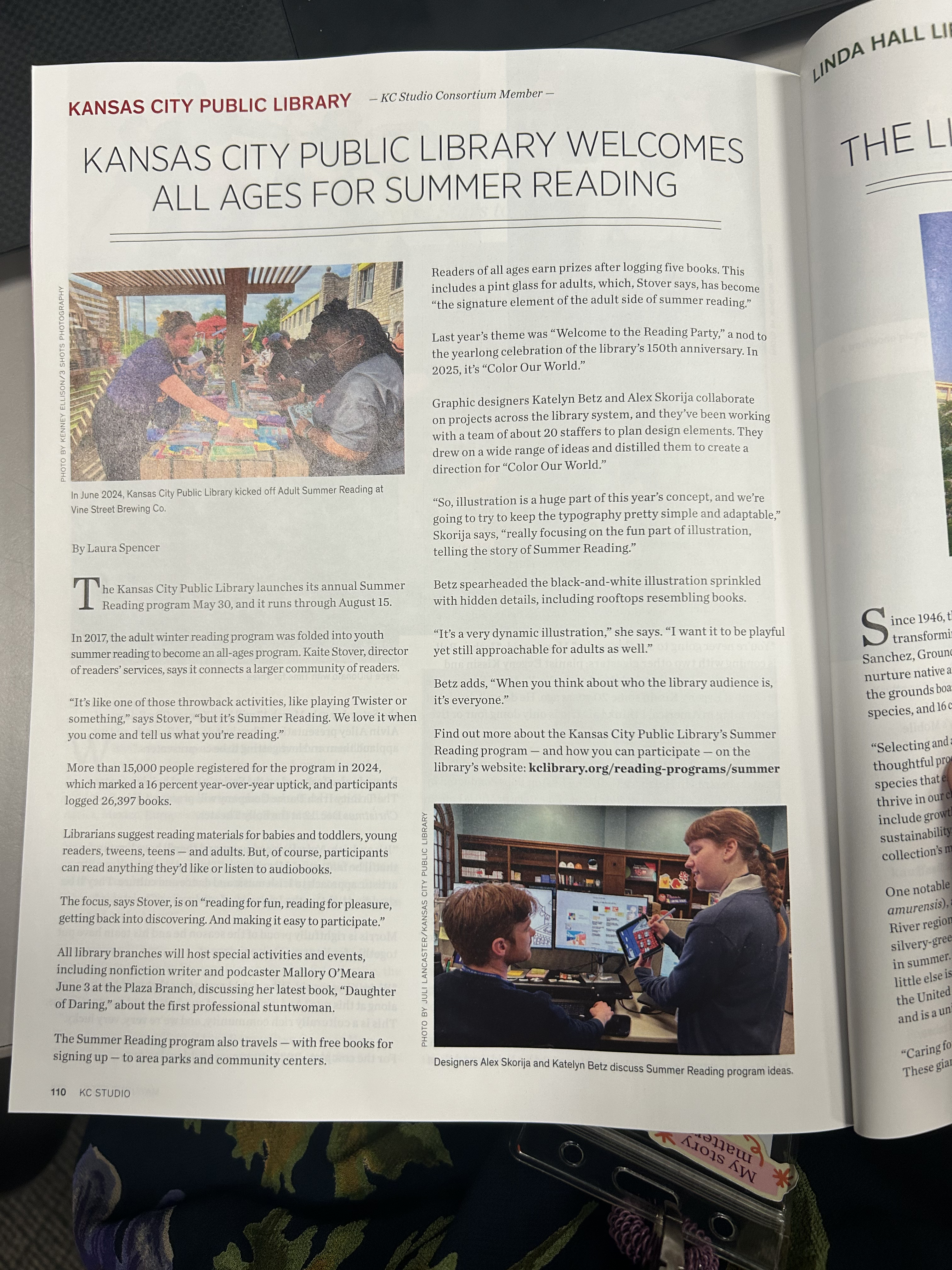 For work, I just finished up all of the illustrations for the Summer Reading Program. My coworker wrote an article about it all for KC Studio and now I am so famous I can’t walk outside without people following me on the street. You can see more of the illustrations here! With collaboration from my coworker Alex, we made stickers, bookmarks, an activity booklet, a pint glass, tote bags, tshirts, two different 4ft displays (that people can color on!) coloring pages, the website, some templates for the library staff.. the list goes on i’m sure. It’s been a lot of work but I love how it all came together.