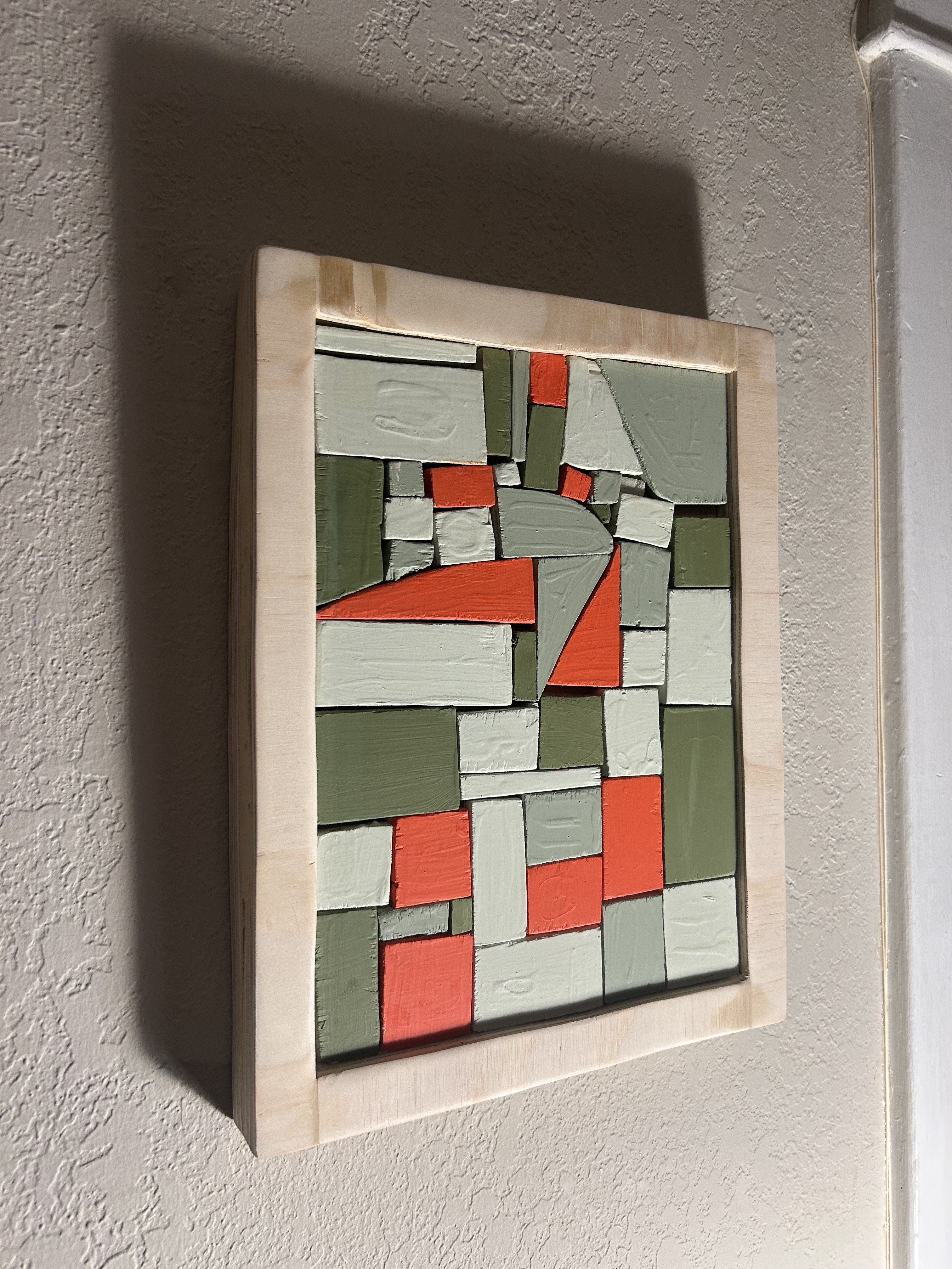 This is made out of scrap wood. I wanted to see if I could puzzle together the chunks without altering them too much. I also made the frame too. This reminds me a lot of what it looks like when you look down on a city from an airplane- all of the chunks of land pieced out. I also took a history class for fun last semester, and I spent a lot of time looking at red lining maps for a project I was working on. This reminds me of those as well. (The history class was really fun, not redlining. Booo redlining.)