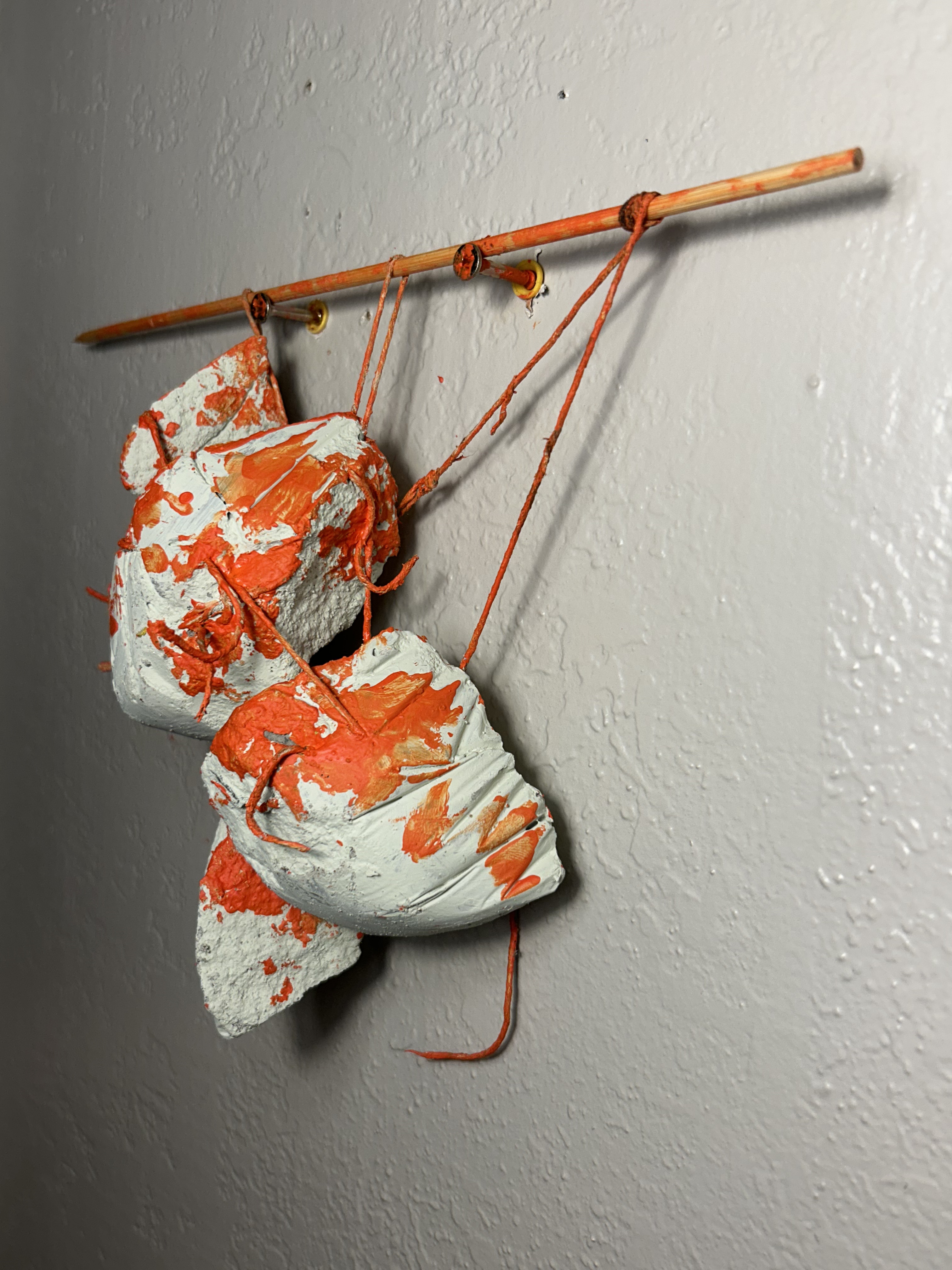 This looks like impaled organs and I really like that! It’s concrete that I cast in a plastic bag to get smooth textures and precise divots, and I put a bunch of yarn all in there. It was fine, but I wasn't sure about it, so I banged it with a hammer to see what would happen. (You will notice a theme there with the city concepts and also hitting things with hammers to make them more interesting.) Then I loved it, and painted the yarn very messily, and hung it on my wall with skewer while it was still wet because I was so excited about it.