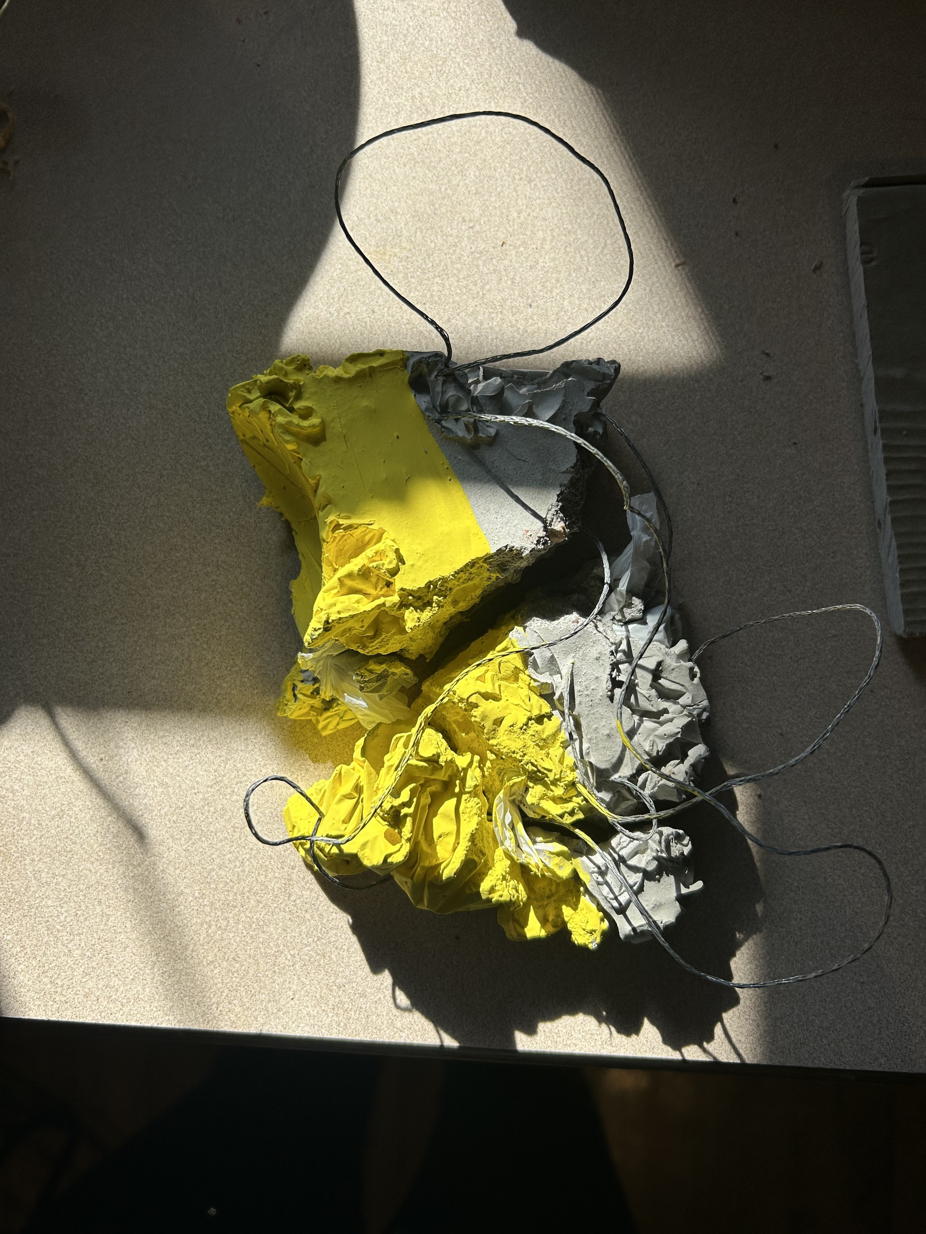 For this, I mixed some concrete, and crumpled it up in plastic, put wire in it, and waited for it to dry. I once again decided to hit it with hammer to see how it broke apart. Looks cool.