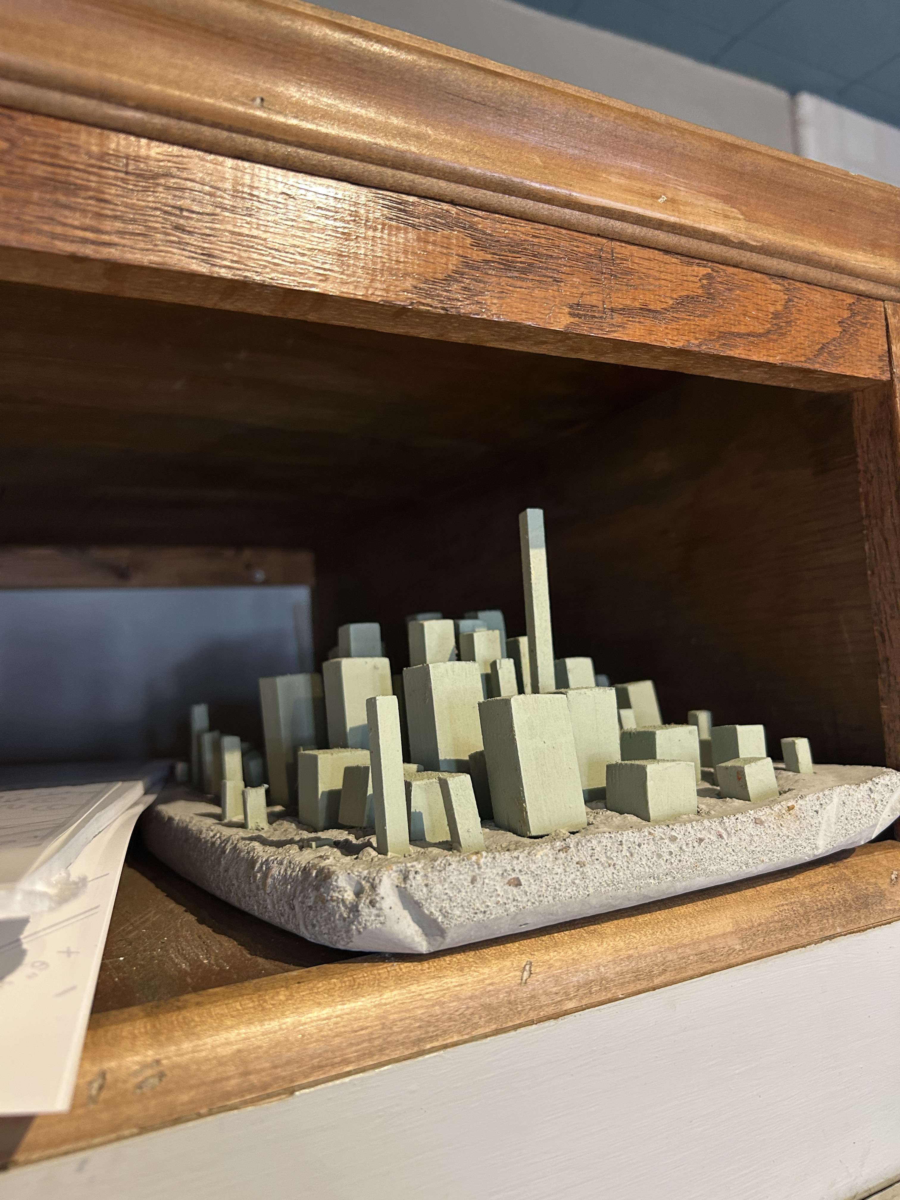 For this, I made a tiny concrete foundation and a little wood house. I put the wood house in here, and while it was drying I decided to take it out. Then it made this cool textural shape. And then I thought... damn.. this is straight up like an empty lot... thats crazy