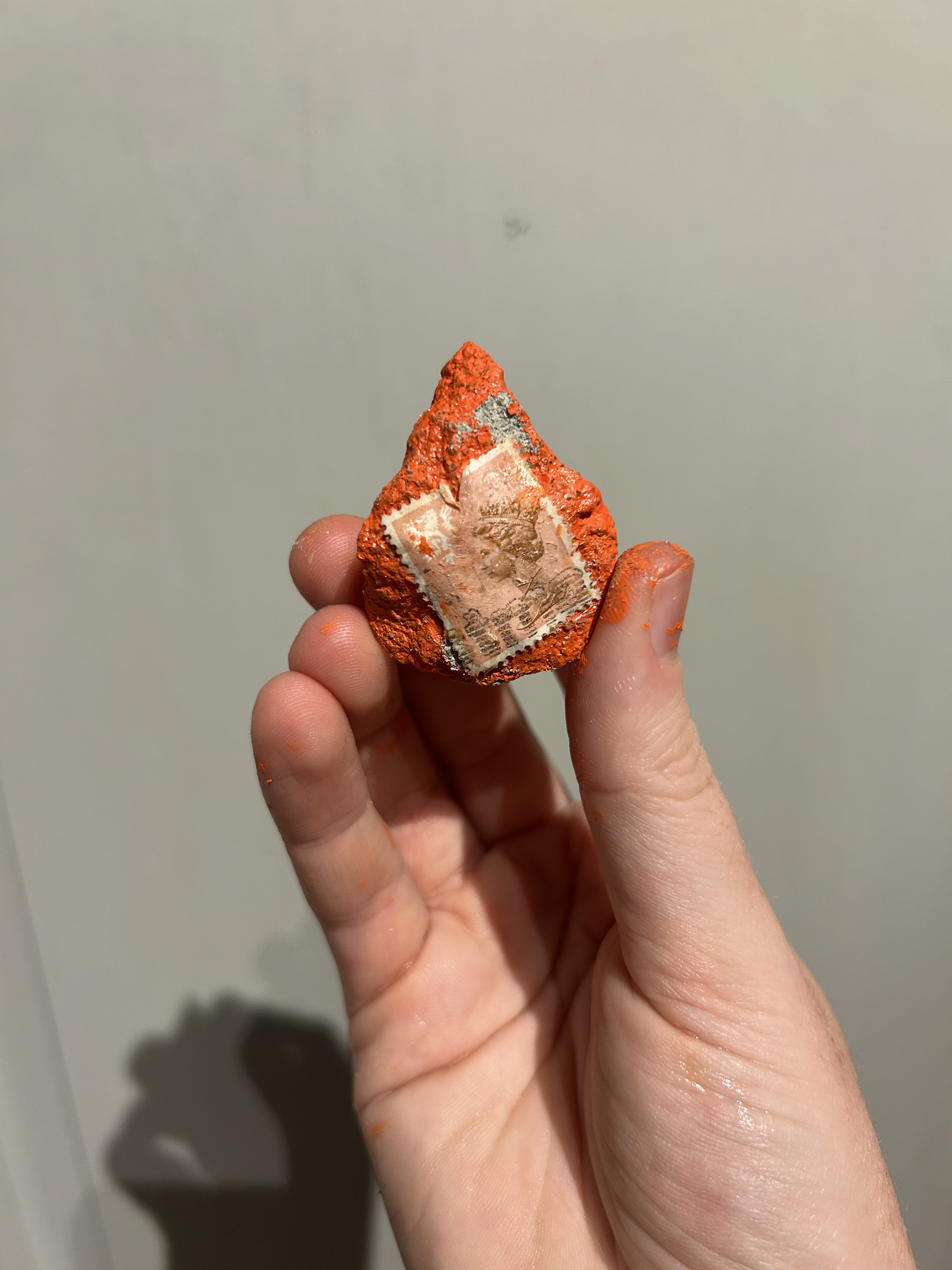 Right now, it’s a chunk of concrete painted with a stamp on it, and it’s lodged between pieces of siding I cut down. It’s still a work in progress, and I am not sure where it is going.I am calling this “Pioneer Species”. To my non-scientist understanding, a pioneer species is a plant that can survive really harsh environments. They are the plants that can grow after fires, and up through parking lots. They inspire plants after them to grow as well. I like to think of humans and the stories they come with as a pioneer species.