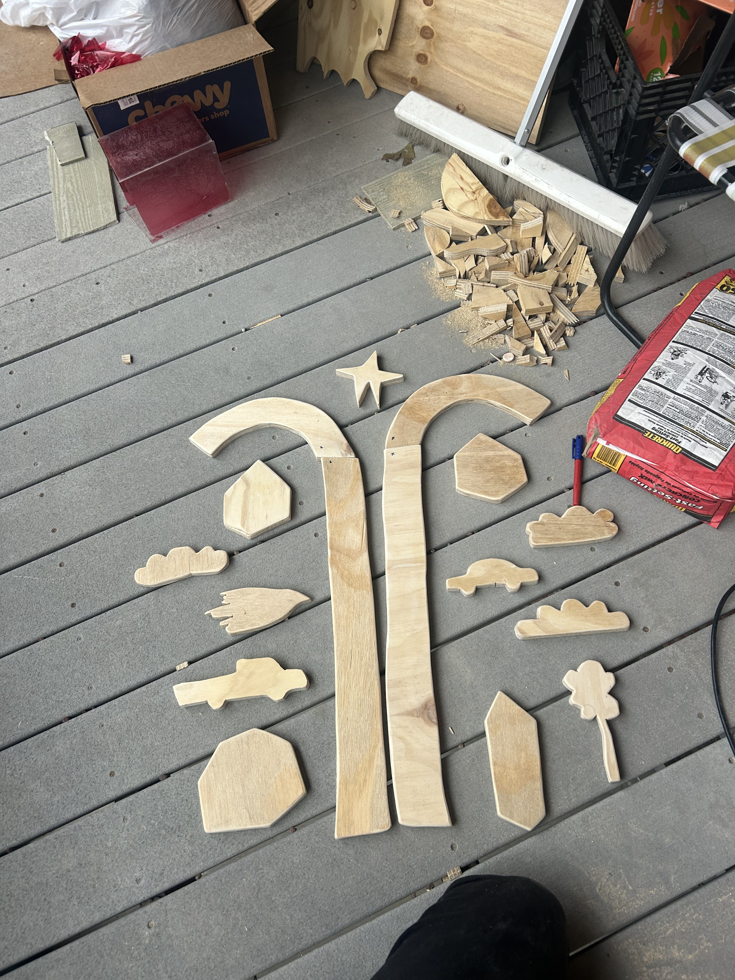 This is made out of a super thick wood that I beveled real nice to look very “story book” and playful. The red shape is a bus, and the green shapes are to represent cars. I love this!!!!!!