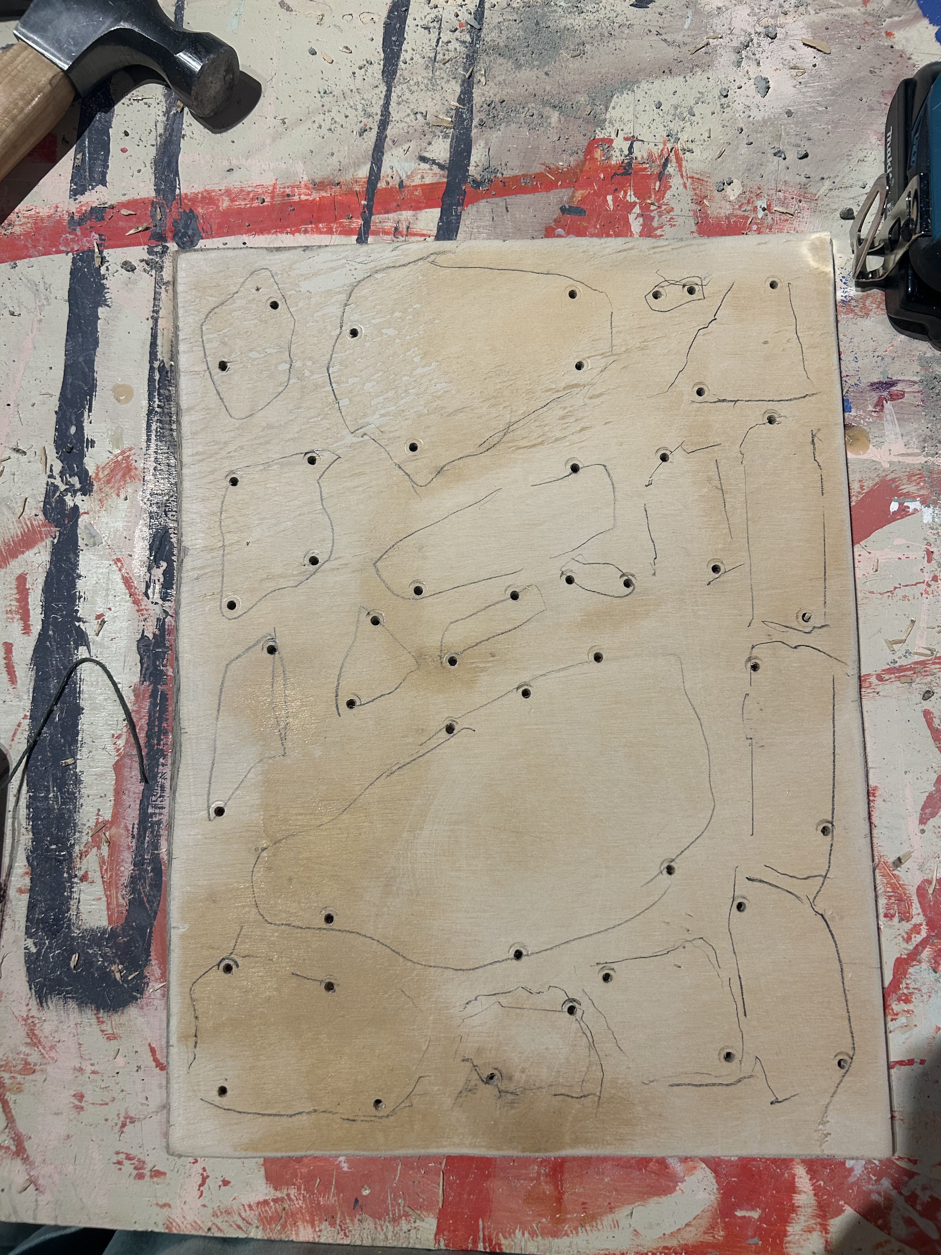 The cut down some wood, traced the chunks, and drilled holes so I could tie them down with hemp cord. (I also glued them down with liquid nails.)