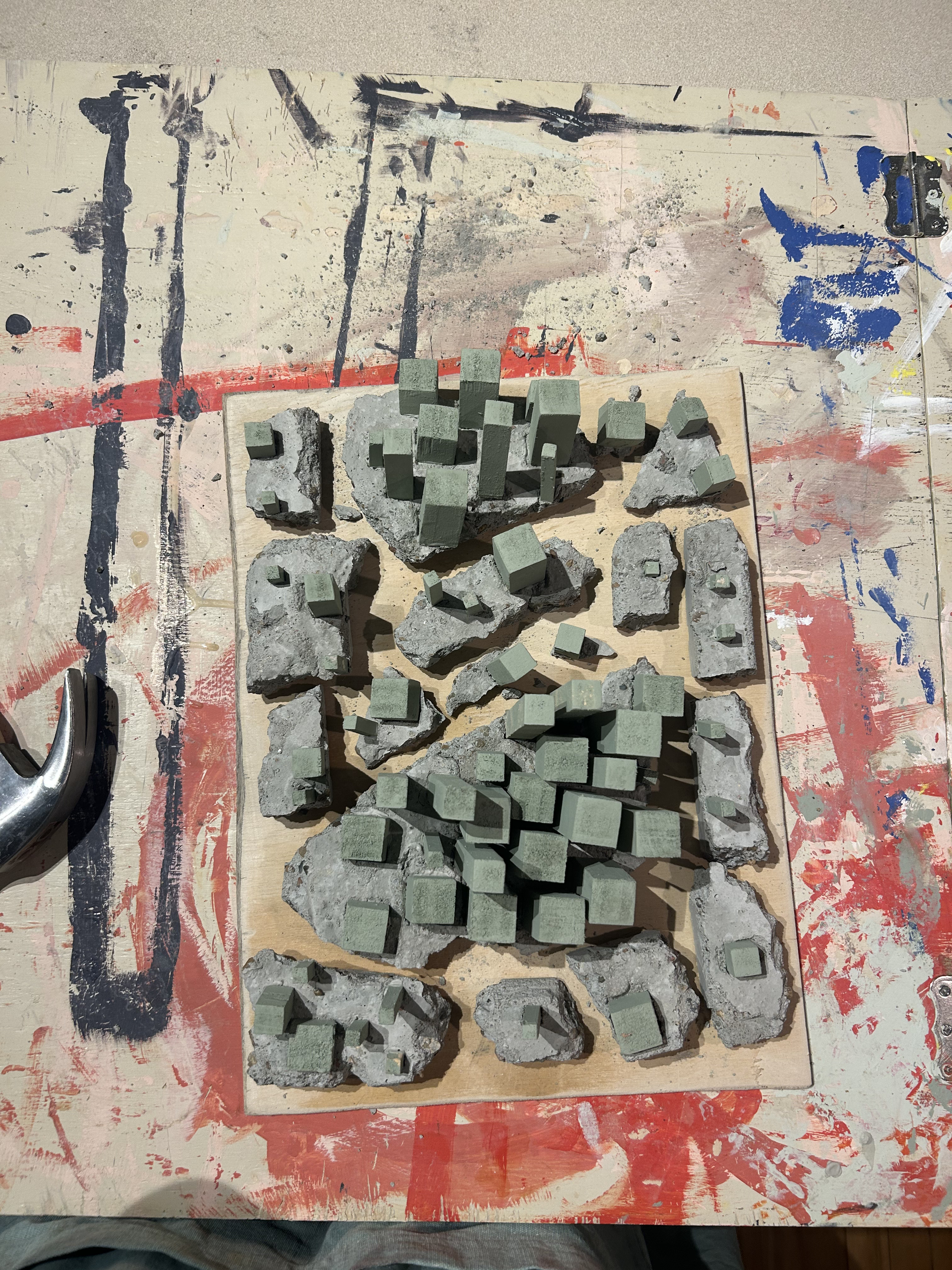 I started with putting a bunch of wood rectangles into some concrete. It was fine but I was bored with it.