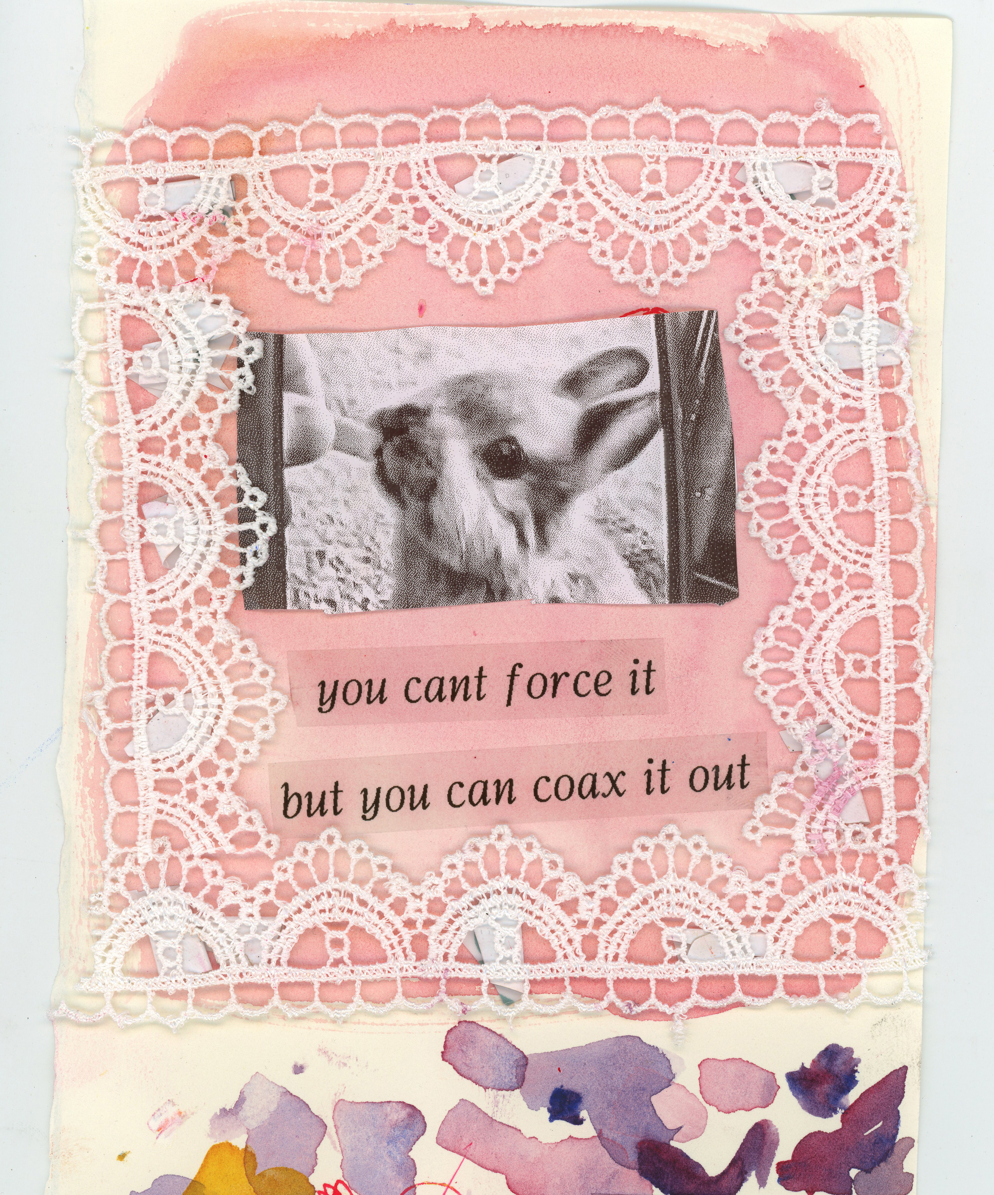 I recently got a label maker to make drawings with, so here is a water color wash with some words made with the machine. I wanted to draw a bunny but I fucked it up, so I just took a picture of the reference photo on my phone with the baby camera, and you guessed it, printed it out. I had this lacey fabric leftover from a sewing project, and I shoved that in my bag before I left because I wanted to play with that. To stick the lace and the photo to the paper, I did not have glue or tape with me, so I used stickers for this very newsletter that I had in my backpack. Yay!