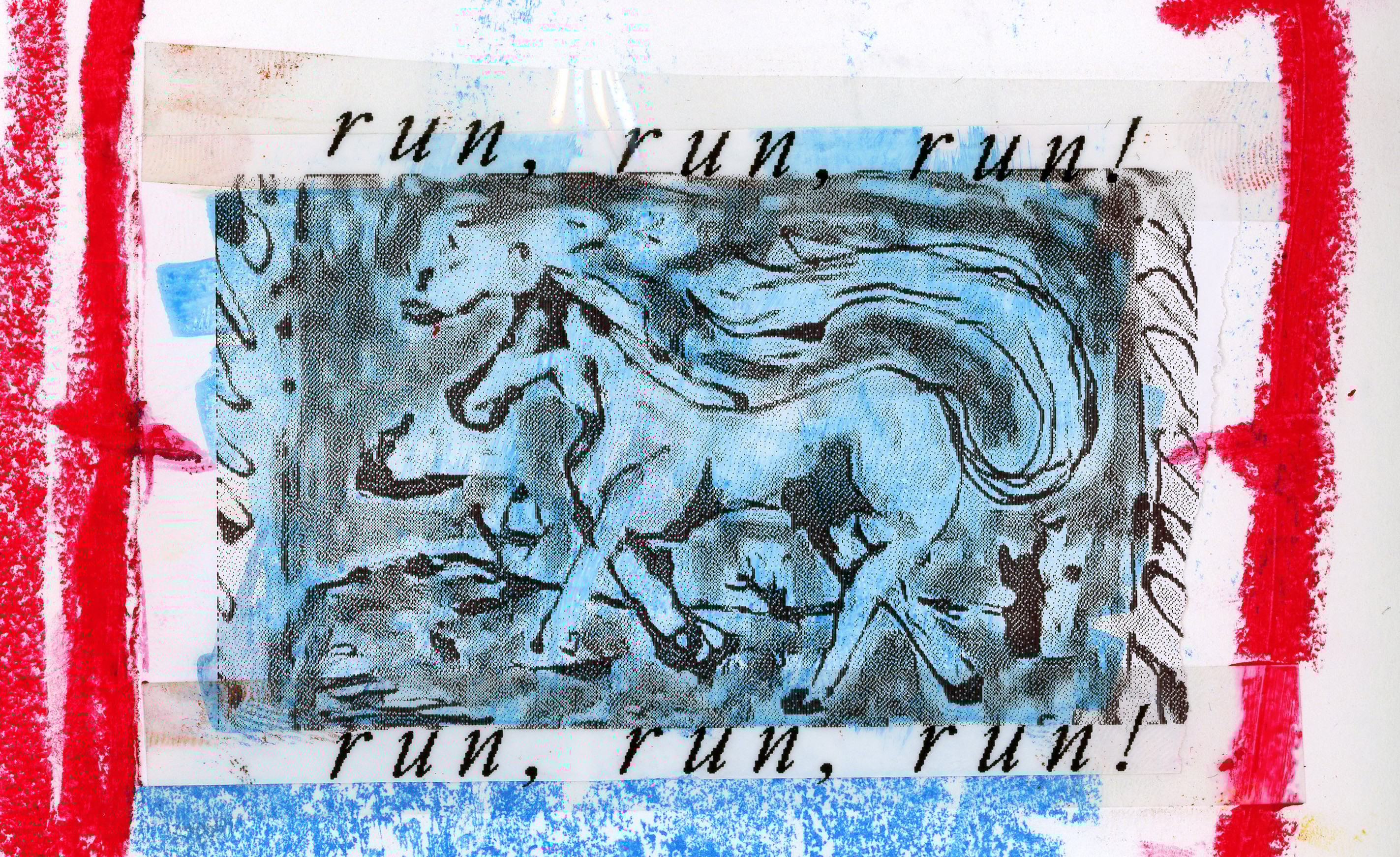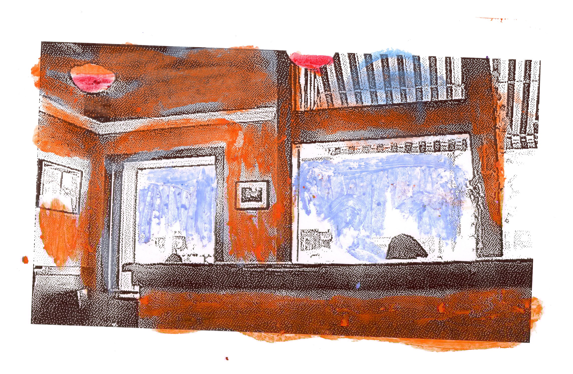 Baby camera print of my view while painting with oil pastel on top.