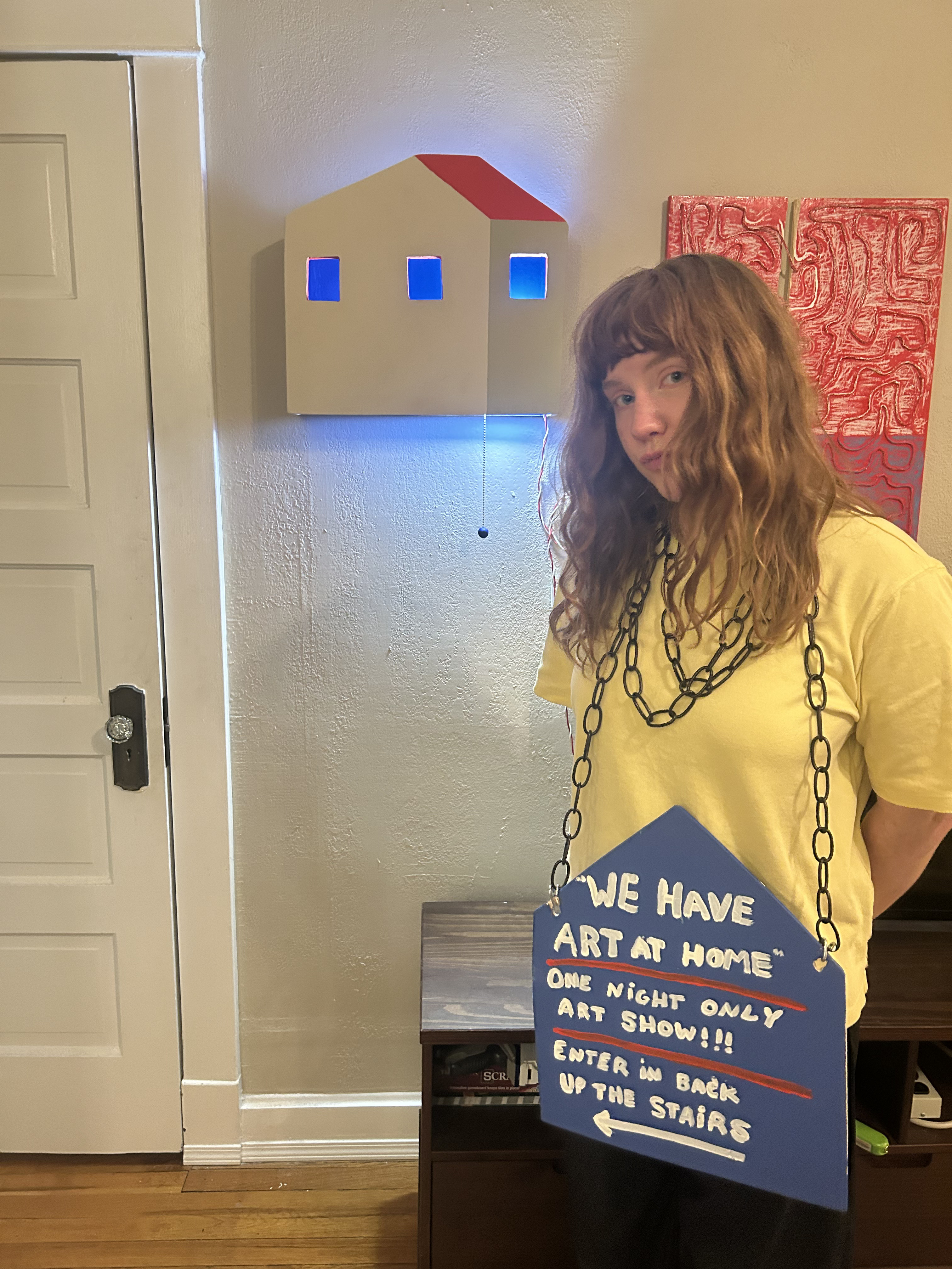 I made this cool sign out of wood and hung it from my front balcony!! I was very excited about the chains. Yes, they're practical for this application, but I mostly wanted to make something with chains. Then, participant Skyler Baker’s work had chains too!!! That was very exciting to me. I felt very excited that someone else thinks chains and wood are cool together. Thank you to participant Jorden Durkee for the sensational video.