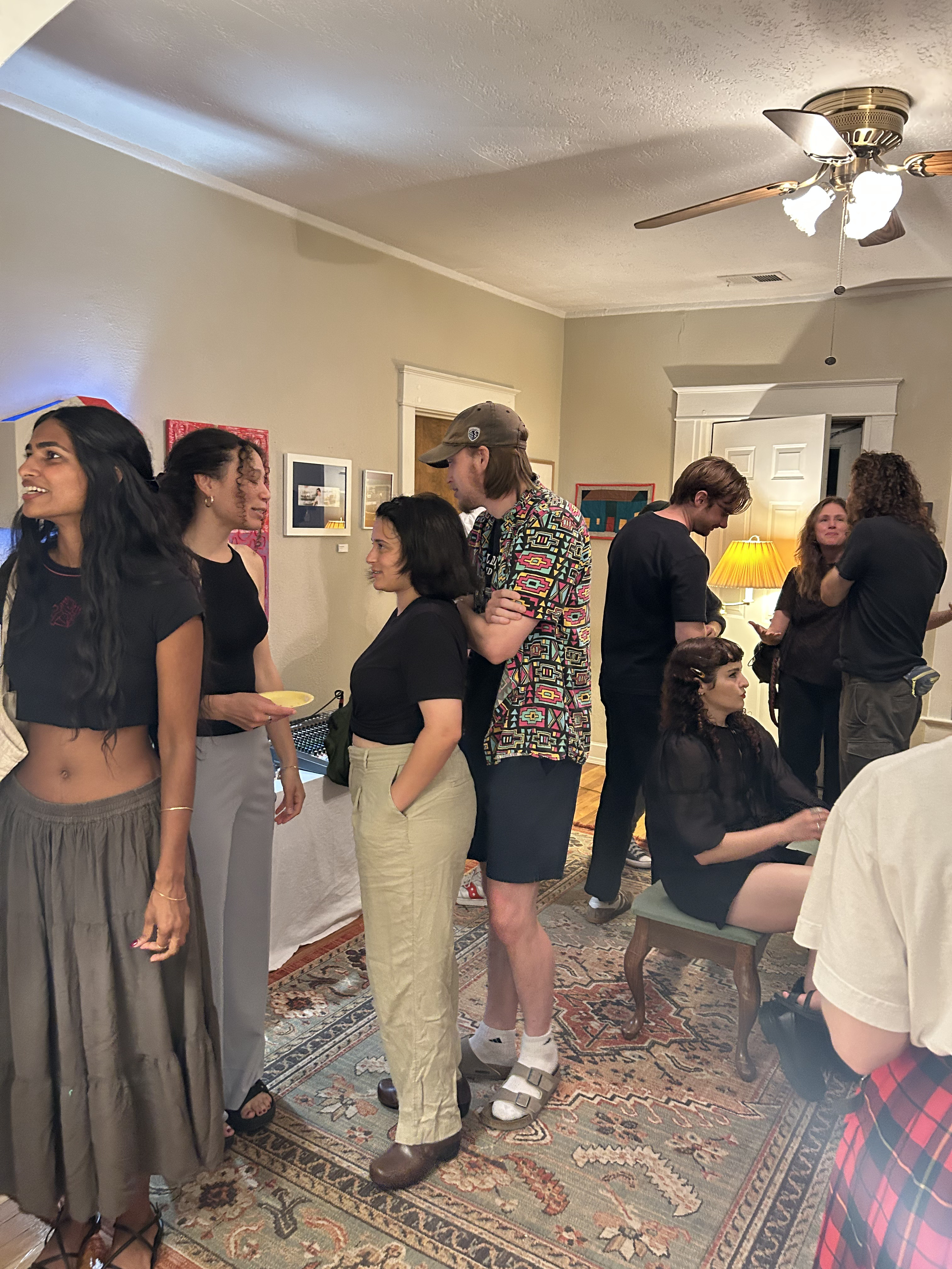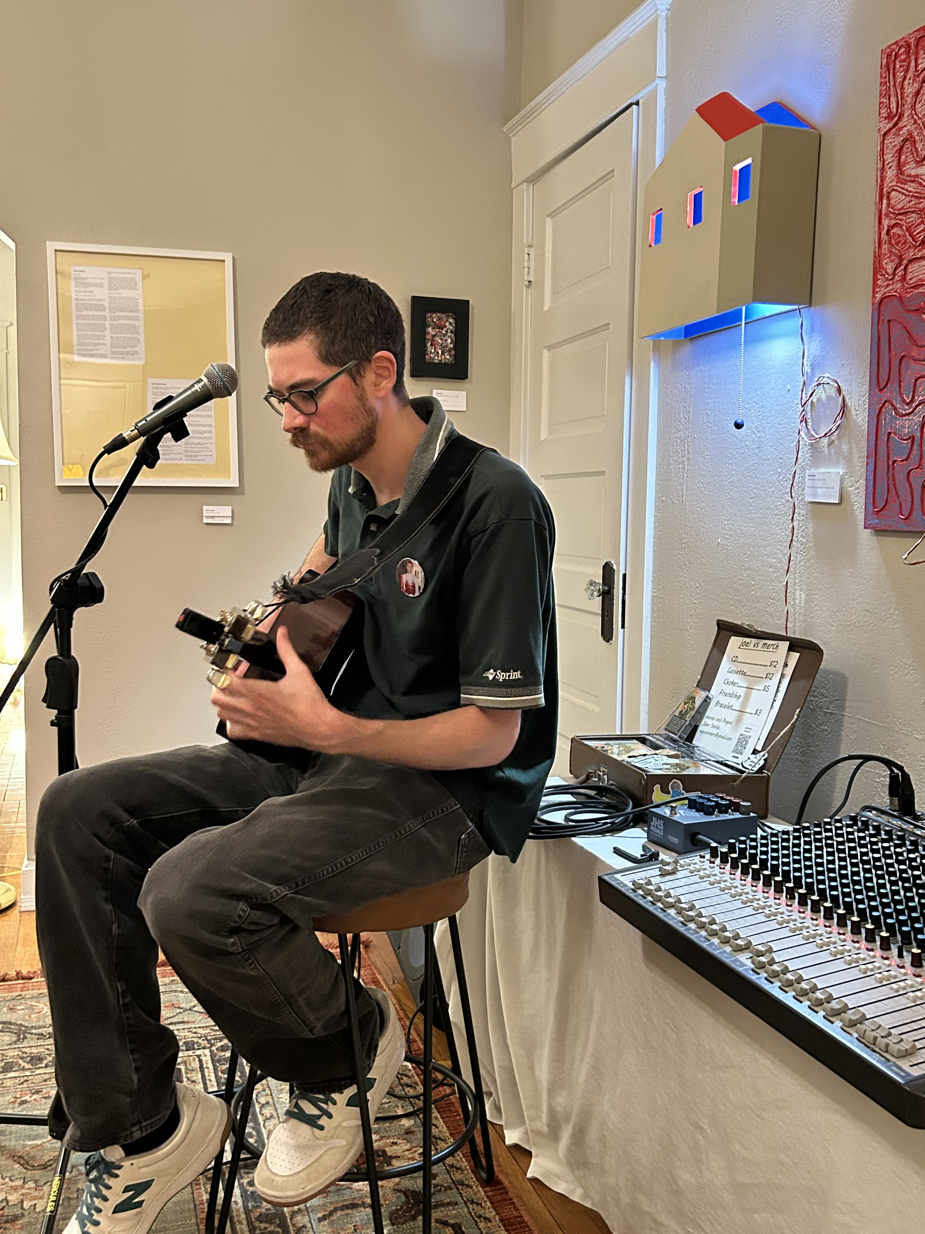 SO because of this special memory, I knew I wanted to have some sort of music element with all of the art. So I had Joel Vs Joel (Joel Stratton perform.) I had a talent show about two years ago and he performed for that too, so it was so cool to have him bring his magic back in my new apartment. There's nothing like putting every chair I own in one room and having people sit on them squished together to hear a human being make music. At the end, he had us all sing along and it was so fun to be in my home with a bunch of people singing a tune.