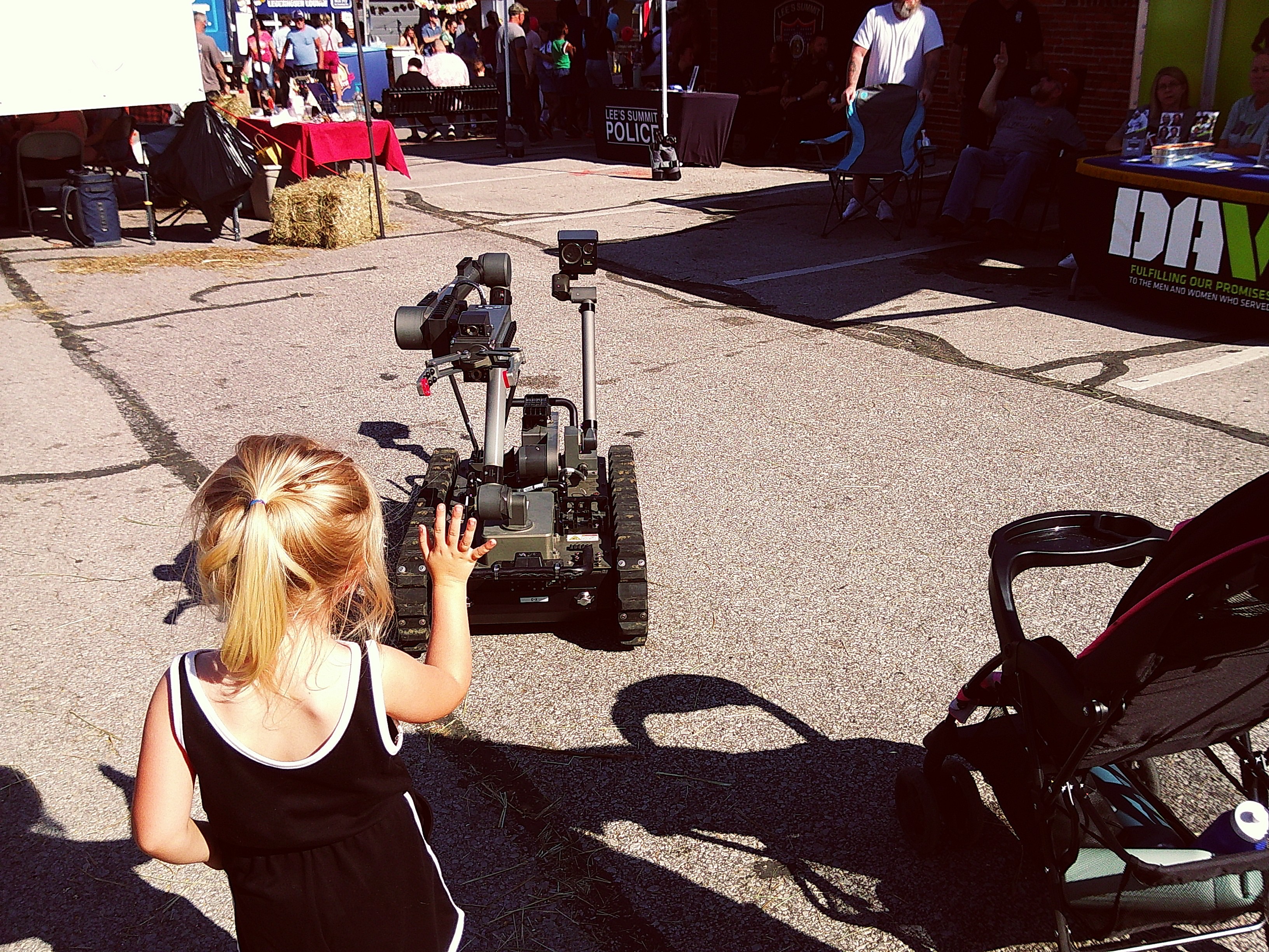 Here she is waving to a robot.
